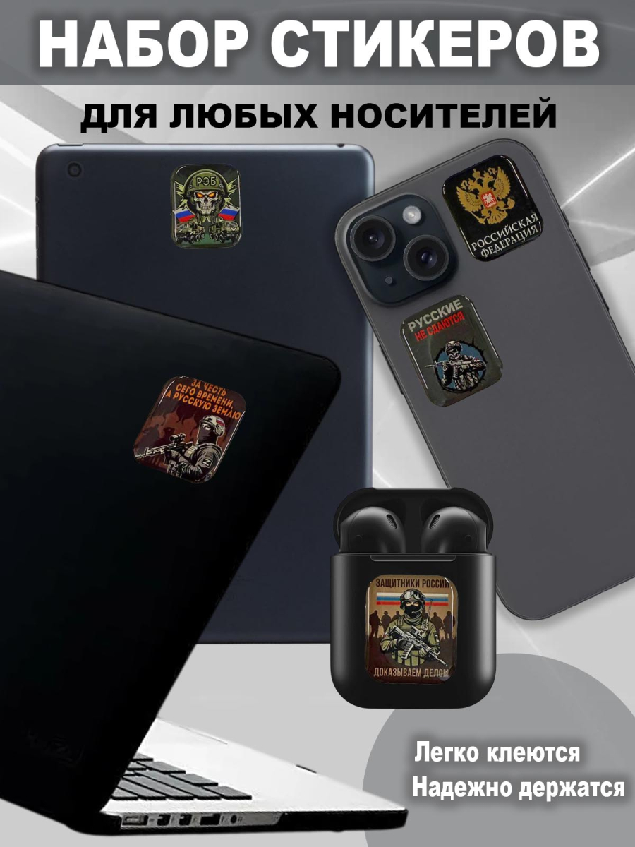 Универсальный набор ярких стикеров  с армейской и патриотической символикой — отличное решение для украшения личных вещей и создания индивидуального стиля. Каждый стикер покрыт прозрачным верхним слоем из полиуретановой смолы, что придаёт изображению эффект объёма, защищает от влаги, выцветания и механических повреждений. Стикеры легко клеятся на телефон, ноутбук, планшет, блокнот или любую гладкую поверхность, держатся прочно и не теряют яркости со временем.