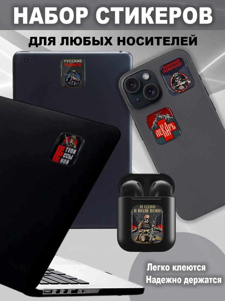 Универсальный набор ярких стикеров  с армейской и патриотической символикой — отличное решение для украшения личных вещей и создания индивидуального стиля. Каждый стикер покрыт прозрачным верхним слоем из полиуретановой смолы, что придаёт изображению эффект объёма, защищает от влаги, выцветания и механических повреждений. Стикеры легко клеятся на телефон, ноутбук, планшет, блокнот или любую гладкую поверхность, держатся прочно и не теряют яркости со временем.