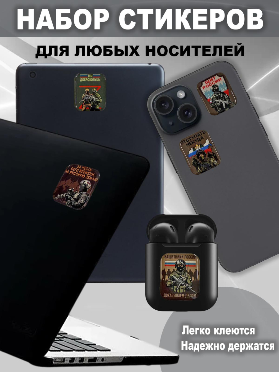 Универсальный набор ярких стикеров  с армейской и патриотической символикой — отличное решение для украшения личных вещей и создания индивидуального стиля. Каждый стикер покрыт прозрачным верхним слоем из полиуретановой смолы, что придаёт изображению эффект объёма, защищает от влаги, выцветания и механических повреждений. Стикеры легко клеятся на телефон, ноутбук, планшет, блокнот или любую гладкую поверхность, держатся прочно и не теряют яркости со временем.