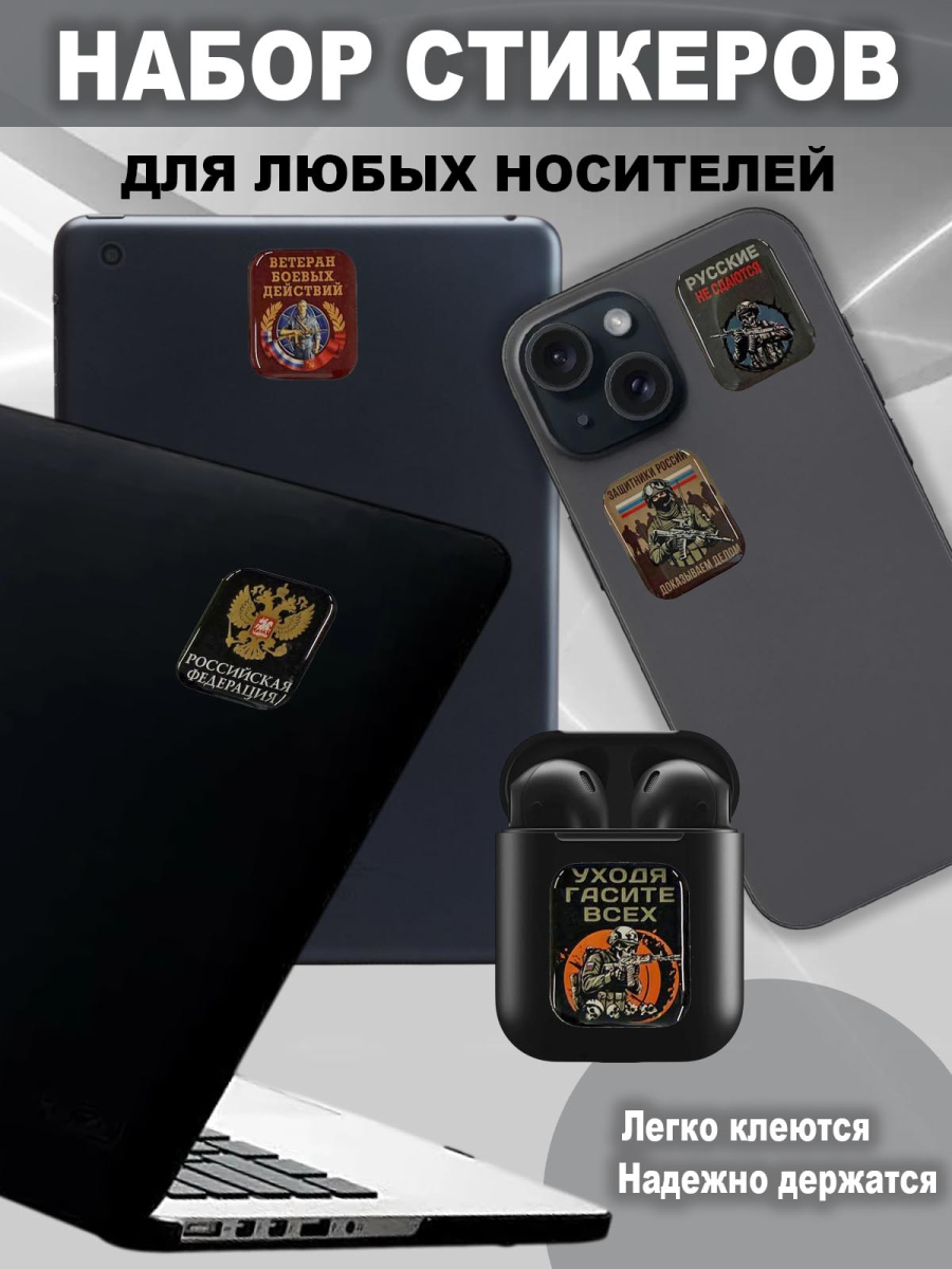Универсальный набор ярких стикеров  с армейской и патриотической символикой — отличное решение для украшения личных вещей и создания индивидуального стиля. Каждый стикер покрыт прозрачным верхним слоем из полиуретановой смолы, что придаёт изображению эффект объёма, защищает от влаги, выцветания и механических повреждений. Стикеры легко клеятся на телефон, ноутбук, планшет, блокнот или любую гладкую поверхность, держатся прочно и не теряют яркости со временем.