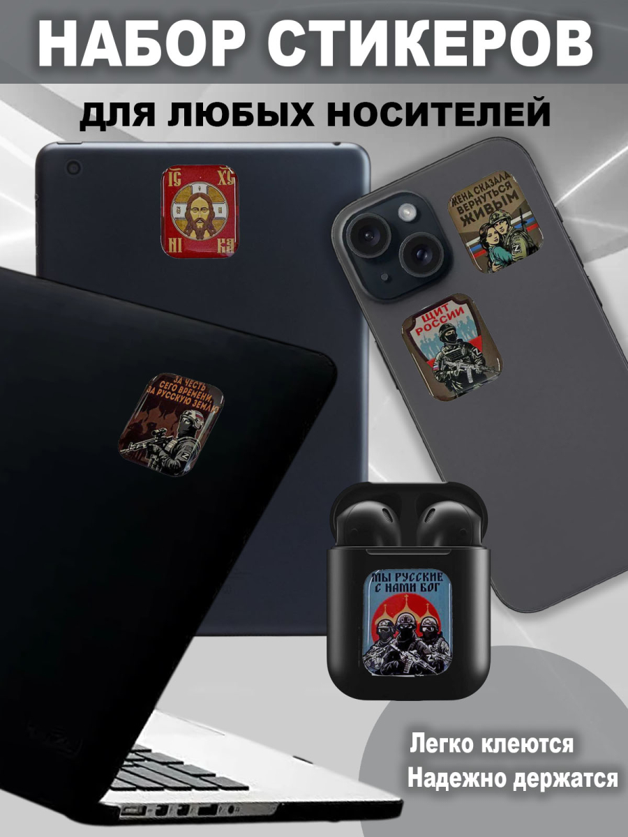 Универсальный набор ярких стикеров  с патриотической символикой — отличное решение для украшения личных вещей и создания индивидуального стиля. Каждый стикер покрыт прозрачным верхним слоем из полиуретановой смолы, что придаёт изображению эффект объёма, защищает от влаги, выцветания и механических повреждений. Стикеры легко клеятся на телефон, ноутбук, планшет, блокнот или любую гладкую поверхность, держатся прочно и не теряют яркости со временем.