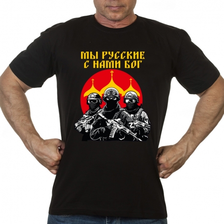 Купить футболку "Мы русские, с нами Бог" можно в Военпро, с удобной доставкой по всей РФ.