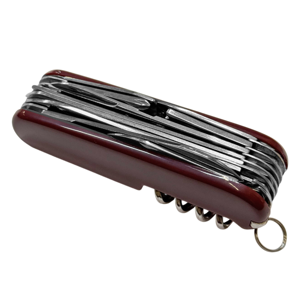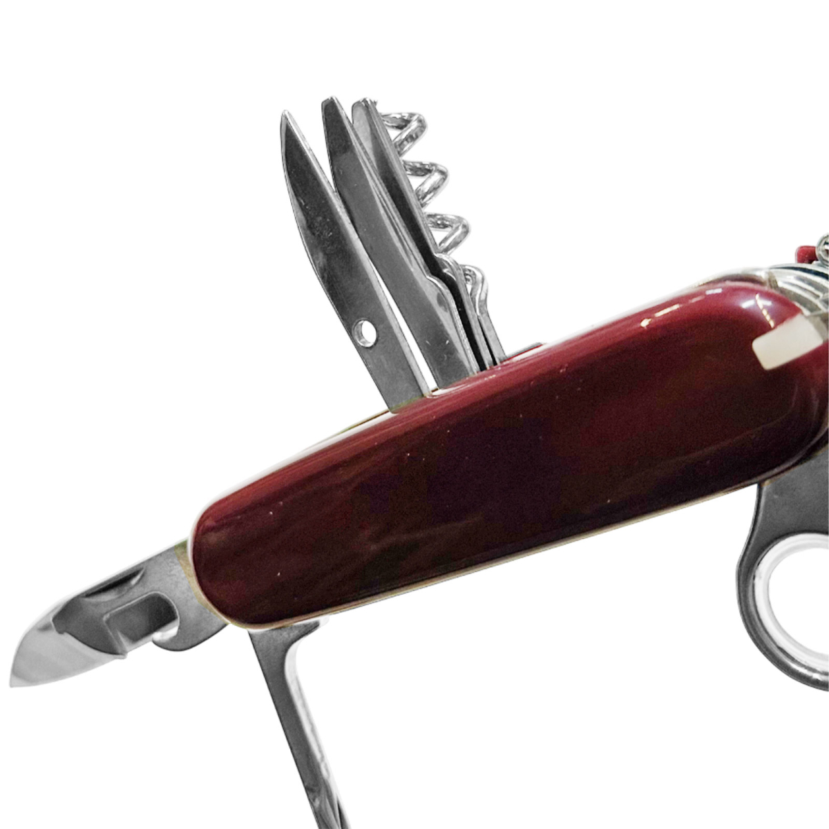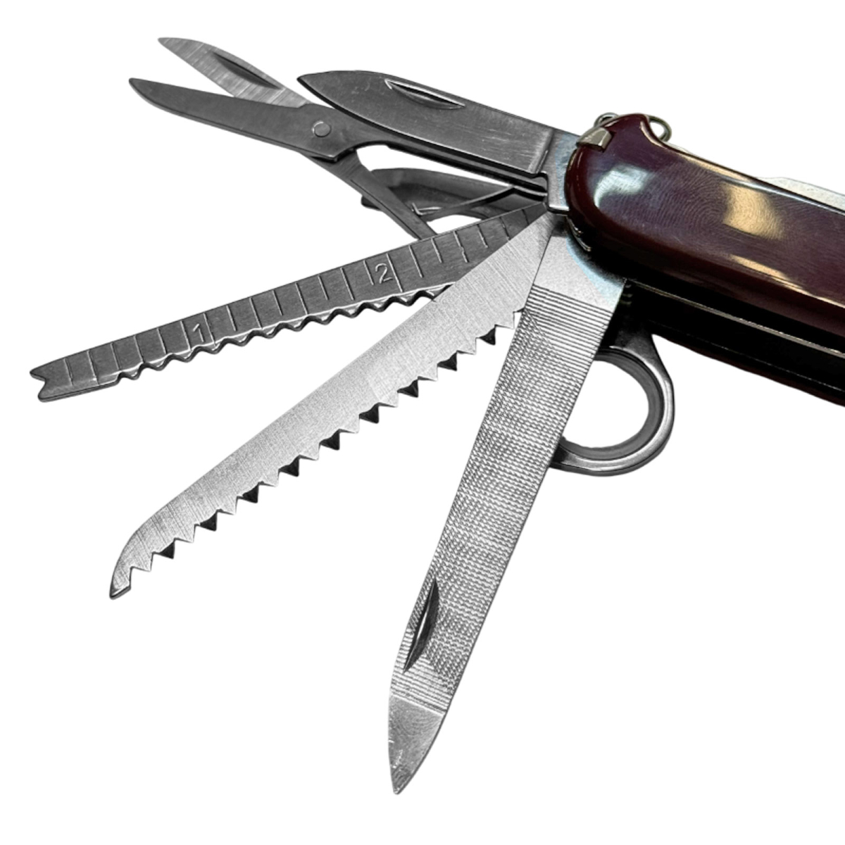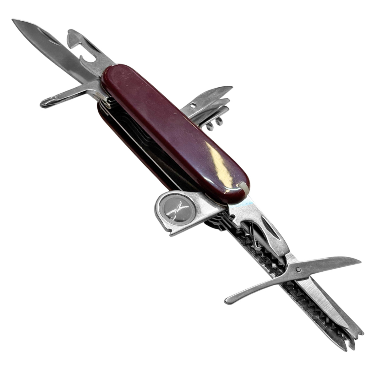 Функции нож; ножницы; штопор; пилы по дереву и металлу; открывалка/консервный нож; напильник; отвёртка; шило; лупа; пинцет; зубочистка; зацеп