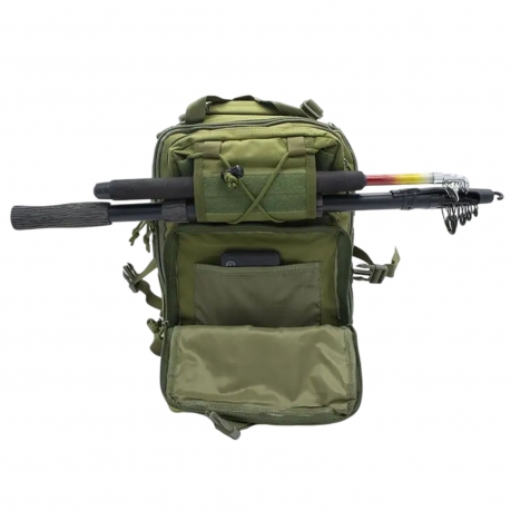 Основное отделение открывается по периметру на молнии и обеспечивает широкий доступ к внутреннему пространству. Внутри предусмотрены дополнительные карманы для организации содержимого, позволяющие разместить документы, смартфон, аккумуляторы, инструменты и другие предметы. Передняя часть рюкзака оснащена несколькими функциональными отделениями на молнии для быстрого доступа к мелким вещам.