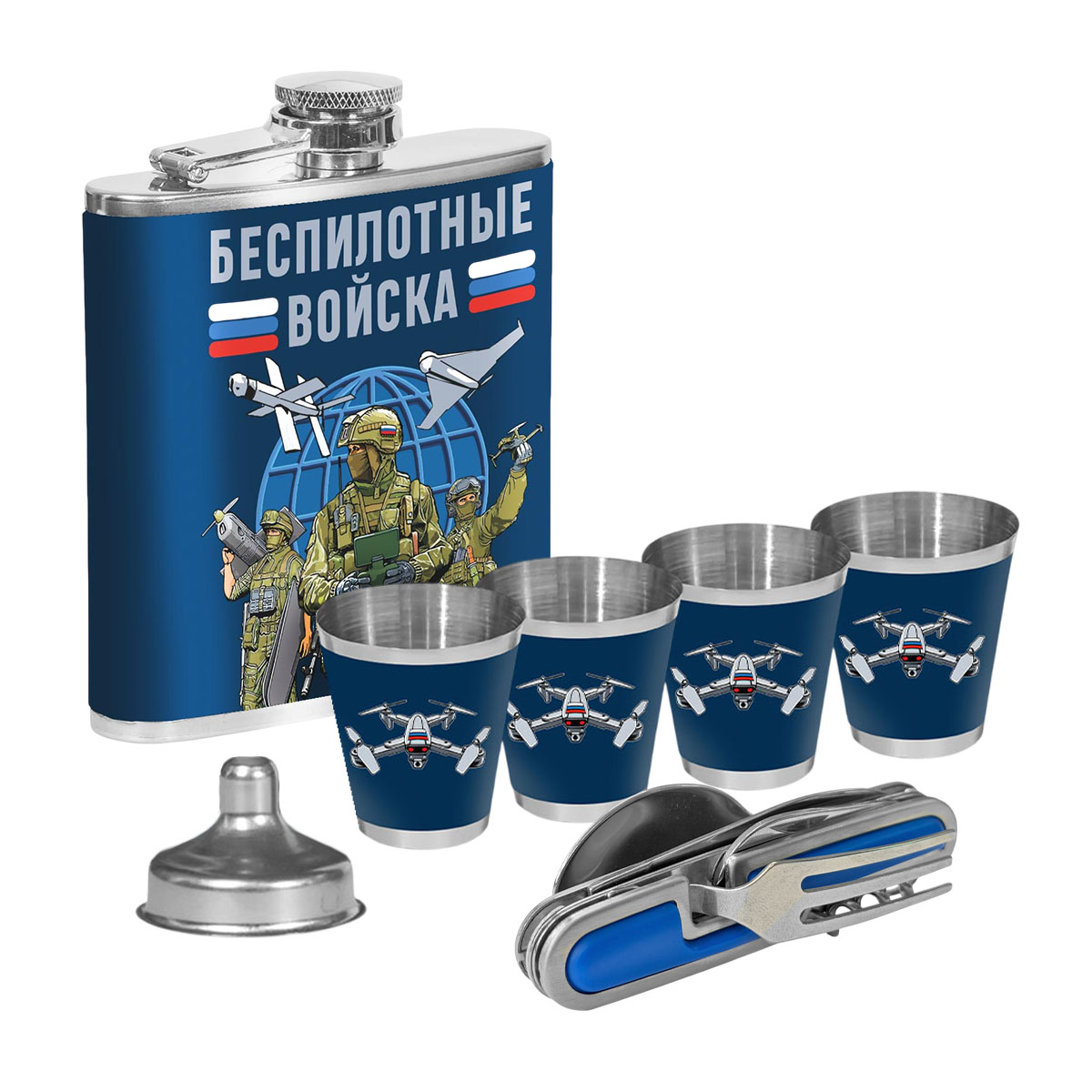 Патриотический набор "Беспилотные войска" к 23 февраля – (мультитул вилка-ложка-нож; фляжка 170 мл (6 oz); 4 стопки по 50 мл; воронка) нержавеющая пищевая сталь AISI 304