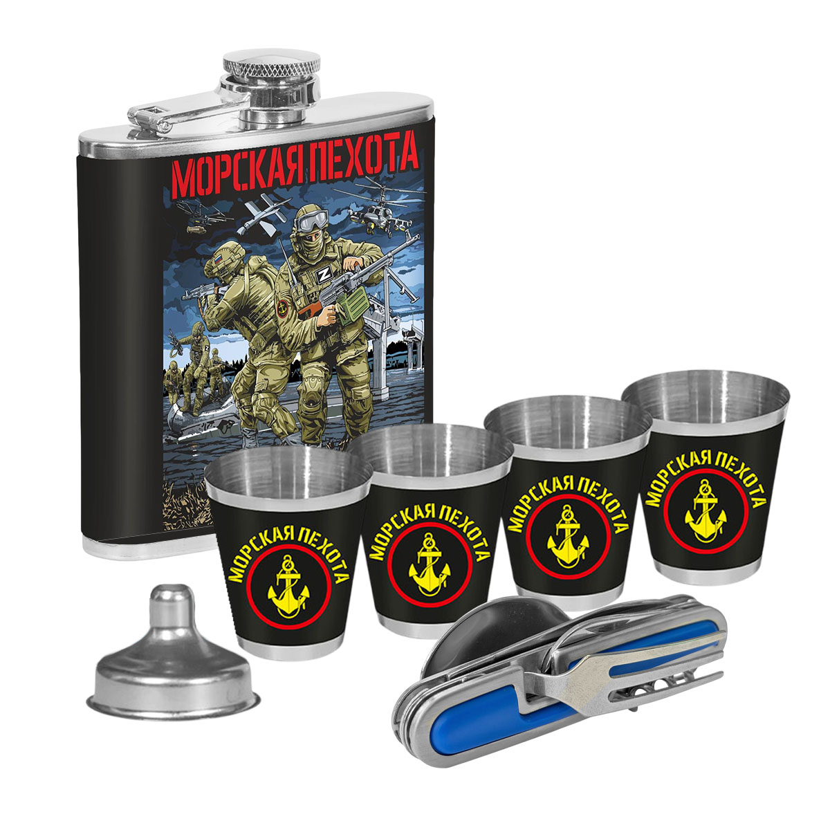 Патриотический набор "Морская пехота" к 23 февраля – (мультитул вилка-ложка-нож №28; фляжка 170 мл (6 oz); 4 стопки по 50 мл; воронка) нержавеющая пищевая сталь AISI 304