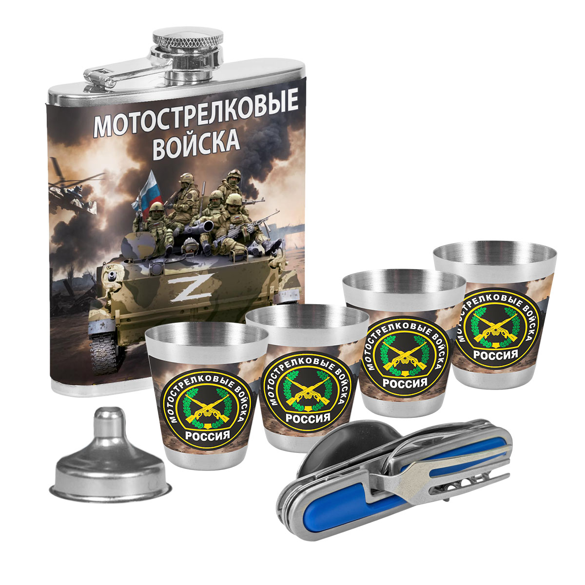 Патриотический набор "Мотострелковые войска" к 23 февраля – (мультитул вилка-ложка-нож №28; фляжка 170 мл (6 oz); 4 стопки по 50 мл; воронка) нержавеющая пищевая сталь AISI 304