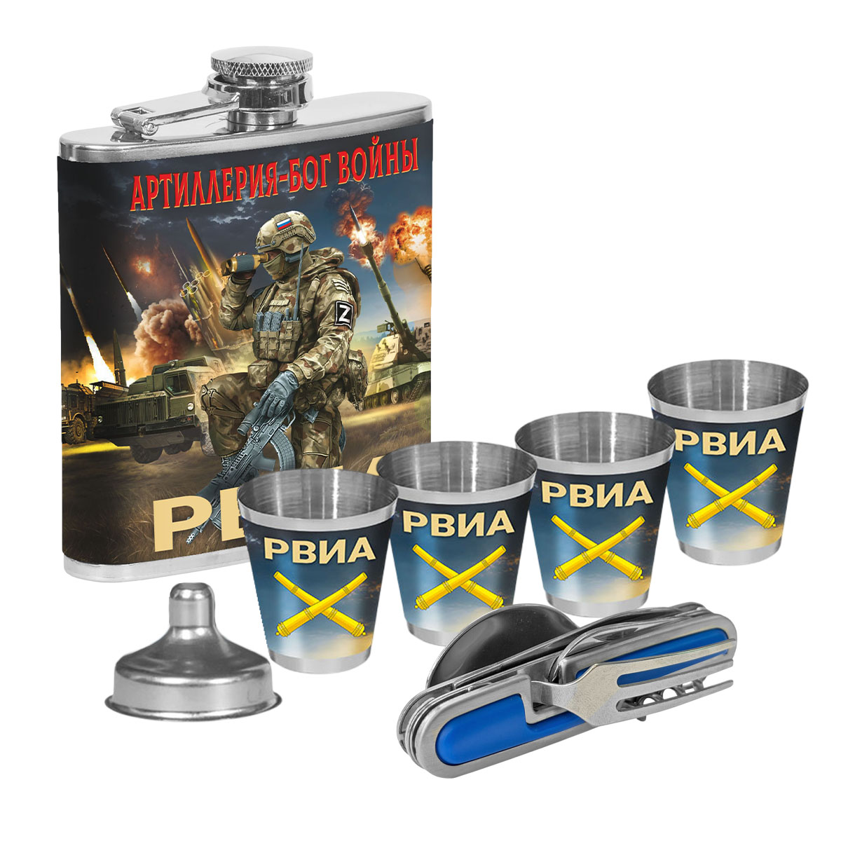 Патриотический набор РВиА "Артиллерия Бог войны" к 23 февраля – (мультитул вилка-ложка-нож; фляжка 170 мл (6 oz); 4 стопки по 50 мл; воронка) нержавеющая пищевая сталь AISI 304