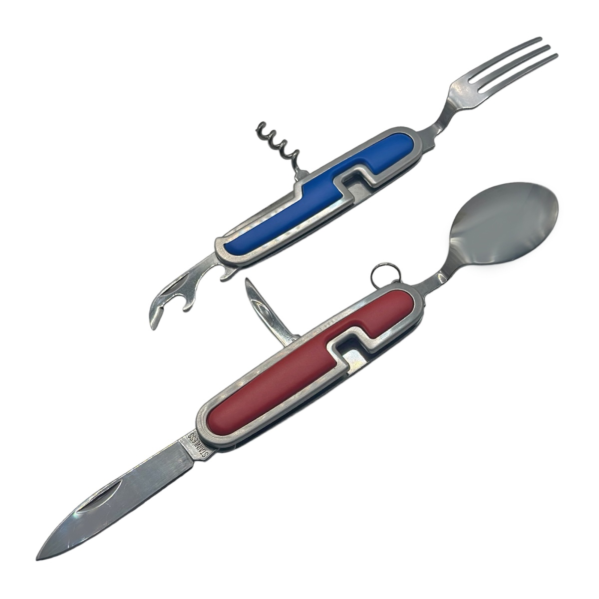 • Функции: нож, вилка, ложка, открывашка для бутылок, штопор, консервный нож