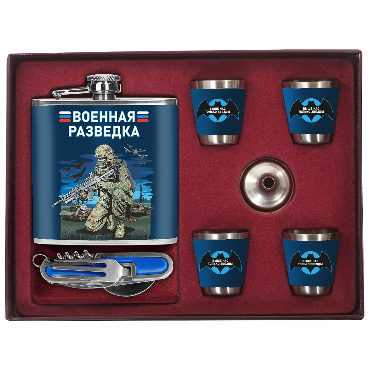 Патриотический набор "Военная разведка" к 23 февраля – (мультитул вилка-ложка-нож №28; фляжка 170 мл (6 oz); 4 стопки по 50 мл; воронка) нержавеющая пищевая сталь AISI 304