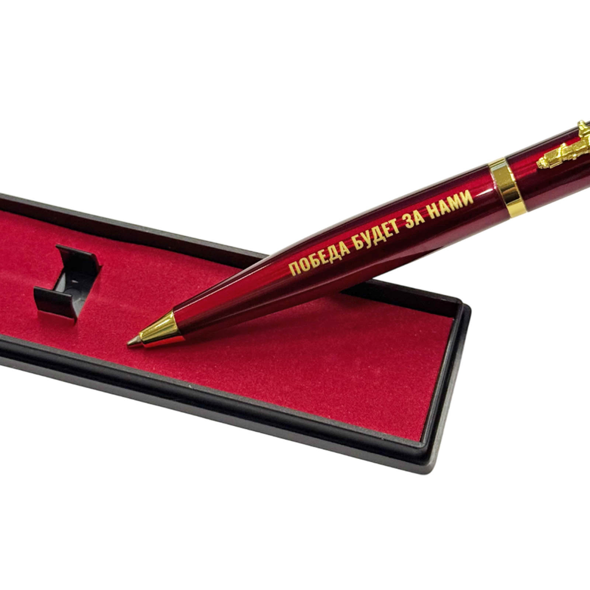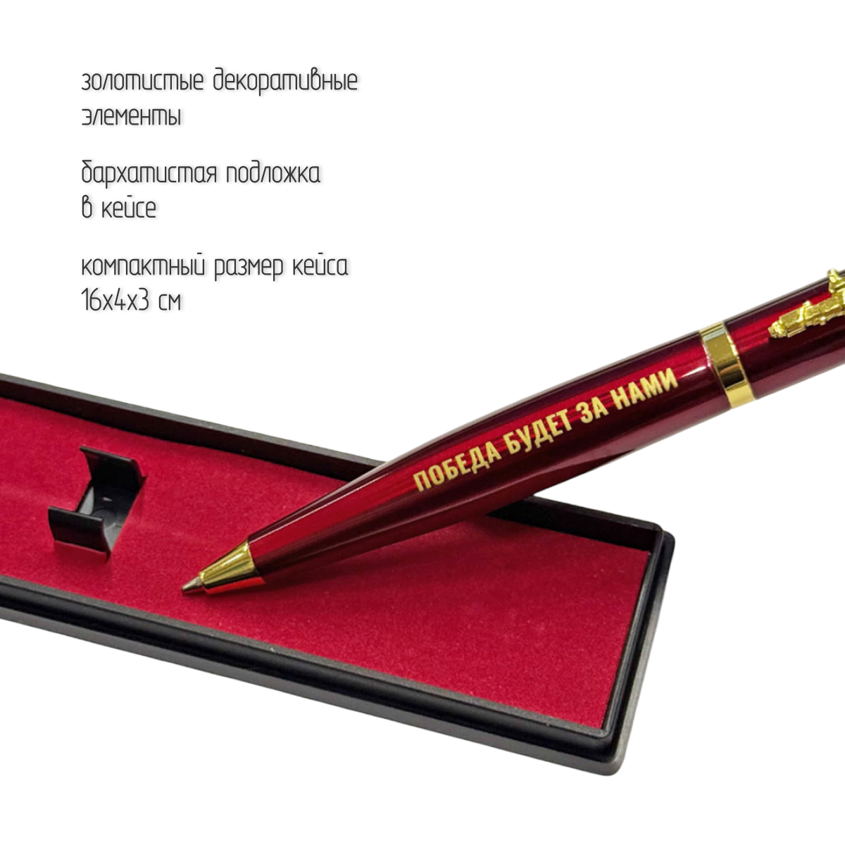 Золотистые декоративные элементы, включая клипсу и торцевые вставки, придают ручке строгий, представительный вид. Тематика оформления – военная и патриотическая, что делает ручку отличным подарком военнослужащим, сотрудникам силовых структур, ветеранам, а также всем, кто дорожит историей и ценит символику силы государства.
