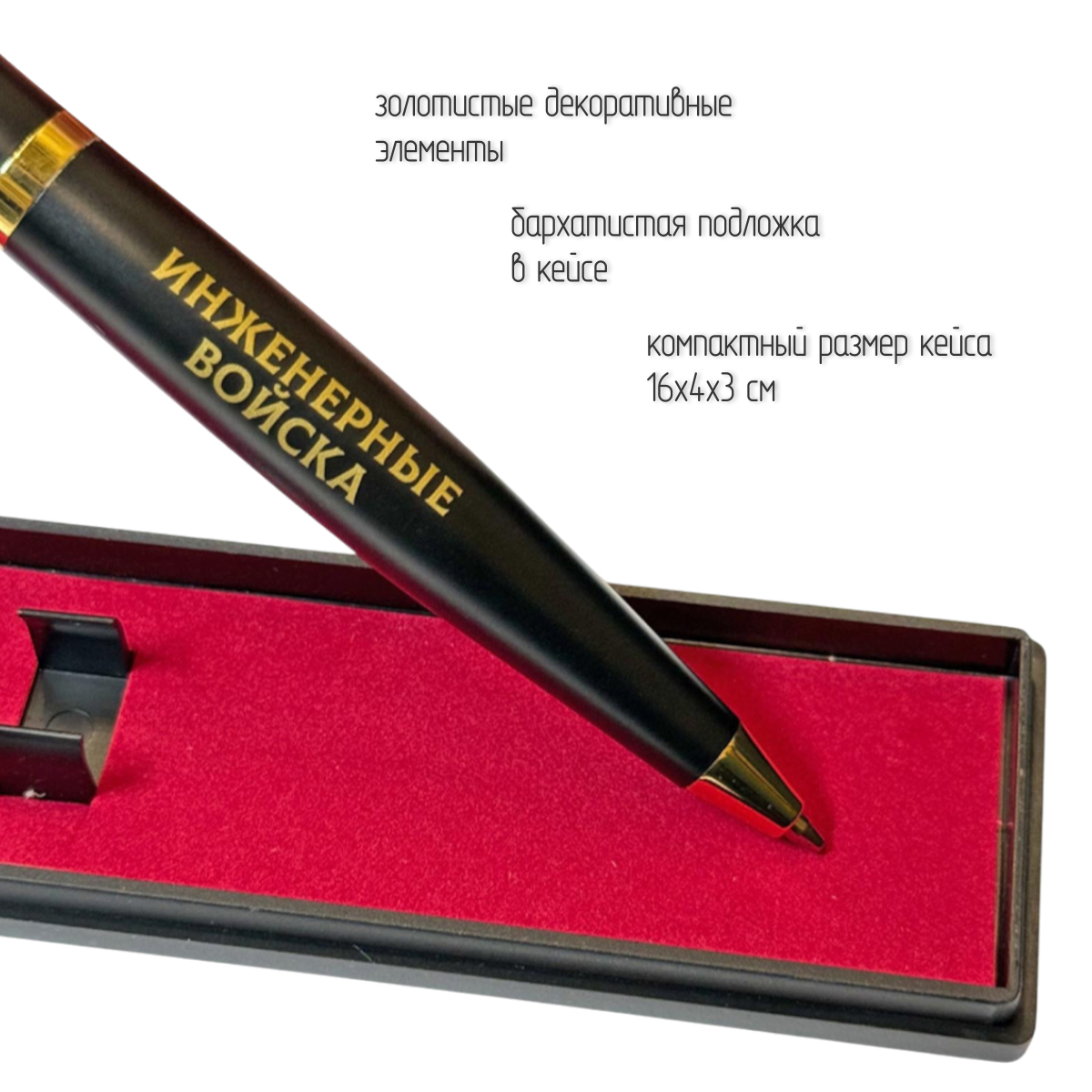Золотистые декоративные элементы, включая клипсу и торцевые вставки, придают ручке строгий, представительный вид. Тематика оформления – военная и патриотическая, что делает ручку отличным подарком военнослужащим, сотрудникам силовых структур, ветеранам, а также всем, кто дорожит историей и ценит символику силы государства.
