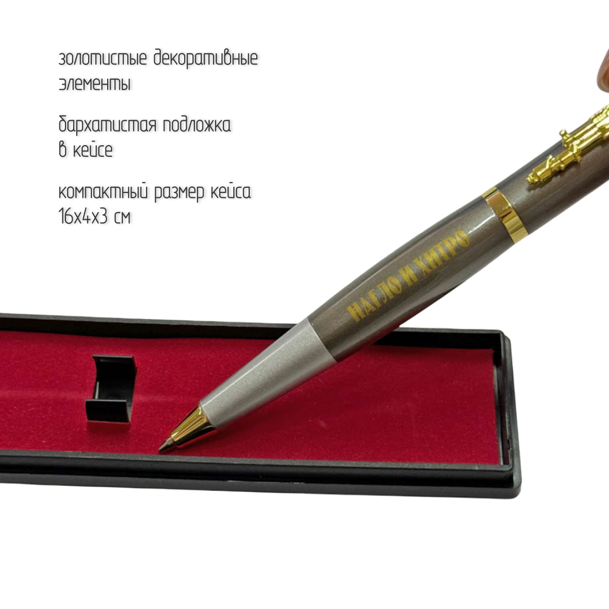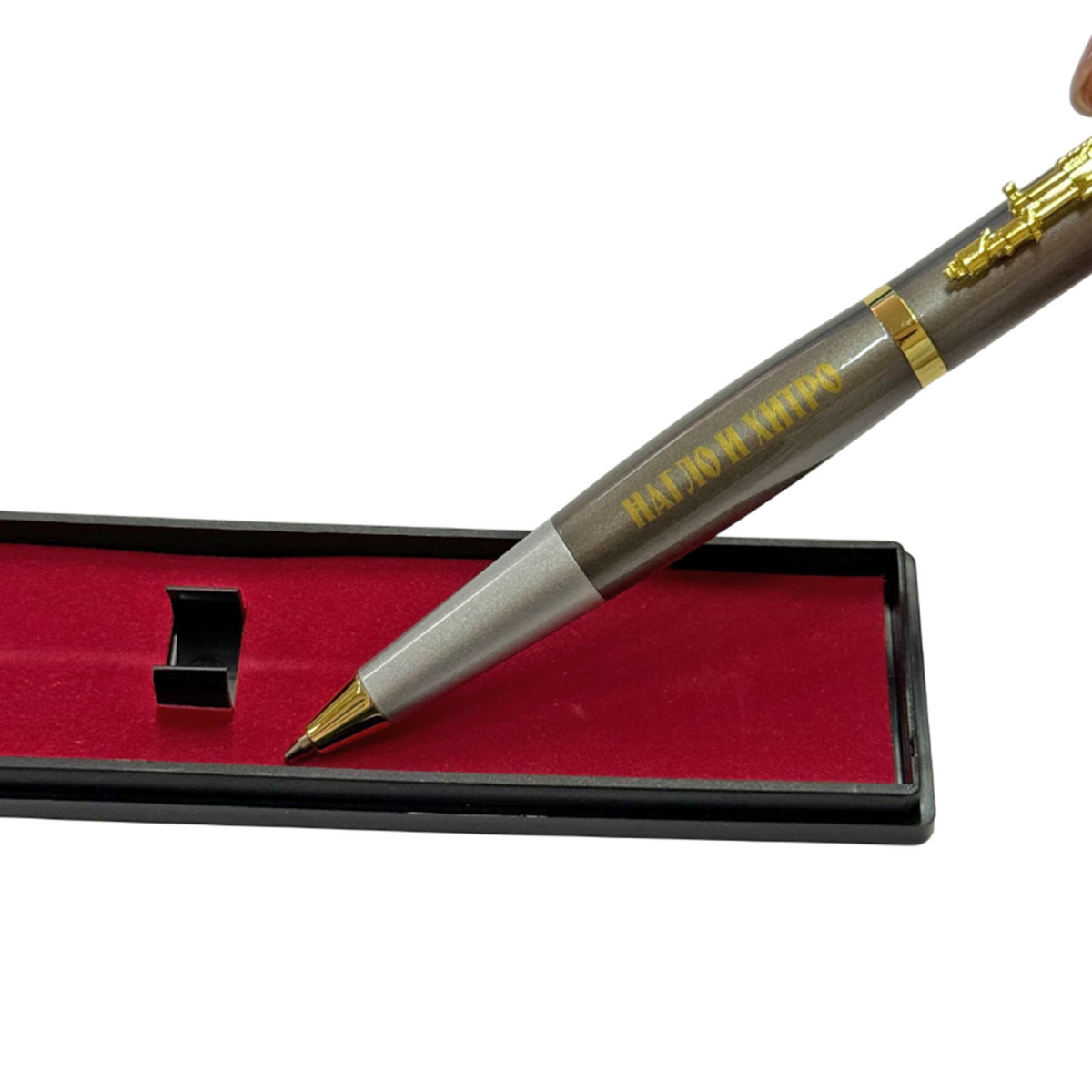 Подарочная шариковая ручка стильный и практичный аксессуар, созданный для тех, кто ценит надёжность, символику и выразительный дизайн. Корпус выполнен из прочного пластика с гладким сатиновым покрытием, благодаря чему ручка комфортно лежит в руке, не скользит и подходит для длительной письменной работы. Наконечник корпуса выполнен в форме боеголовки ракеты «Орешник», подчёркивая патриотичный характер ручки.