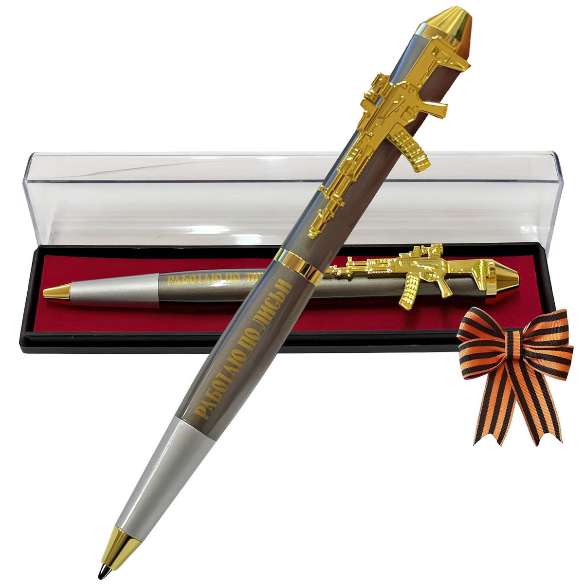 Золотистые декоративные элементы, включая клипсу и торцевые вставки, придают ручке строгий, представительный вид. Тематика оформления – военная и патриотическая, что делает ручку отличным подарком военнослужащим, сотрудникам силовых структур, ветеранам, а также всем, кто дорожит историей и ценит символику силы государства.