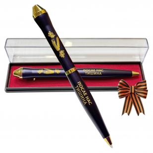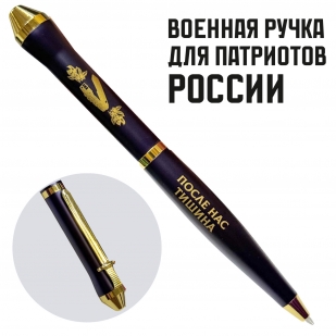 Золотистые декоративные элементы, включая клипсу и торцевые вставки, придают ручке строгий, представительный вид. Тематика оформления – военная и патриотическая, что делает ручку отличным подарком военнослужащим, сотрудникам силовых структур, ветеранам, а также всем, кто дорожит историей и ценит символику силы государства.