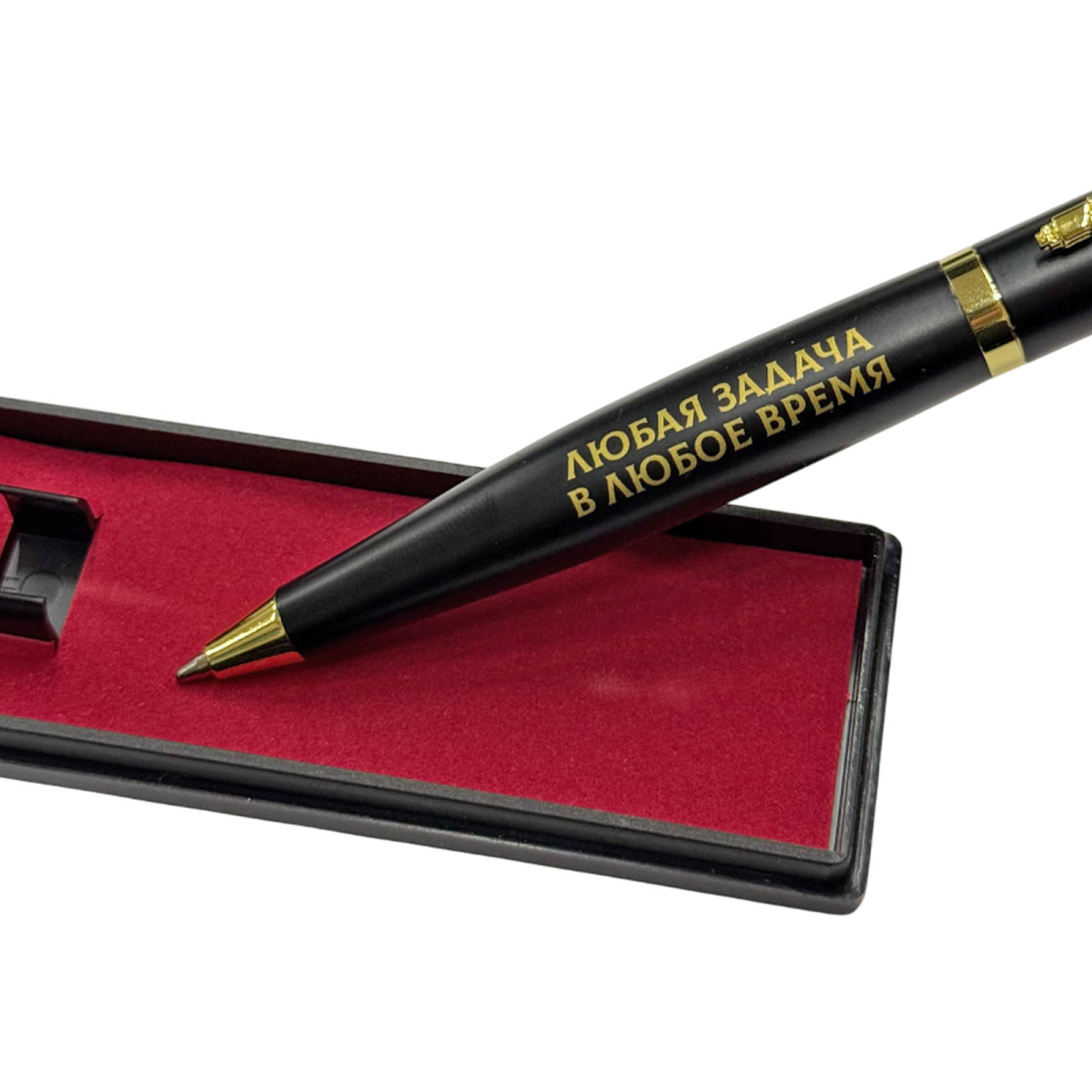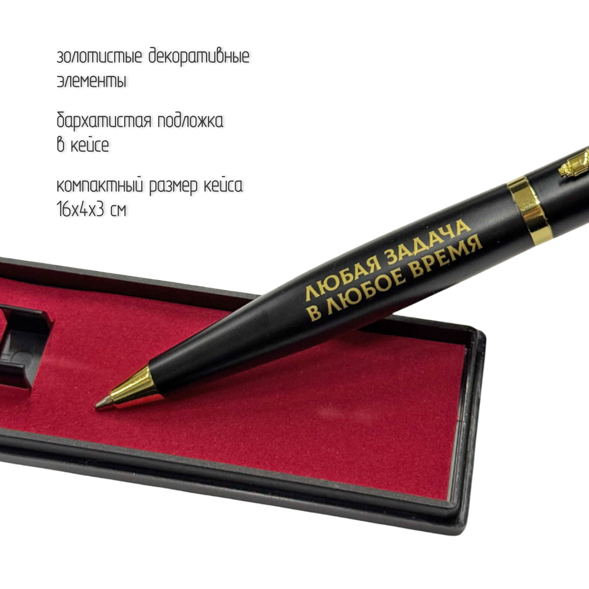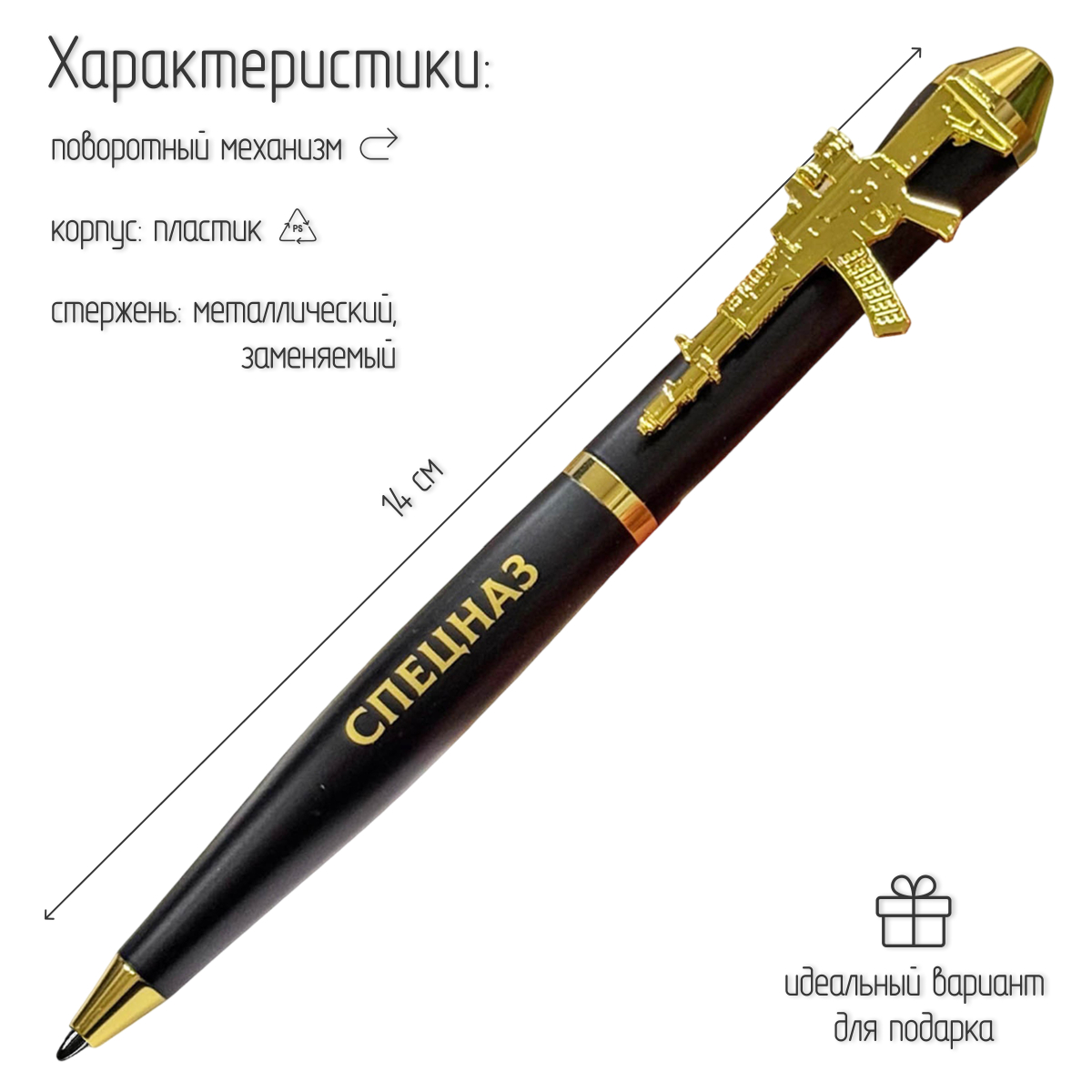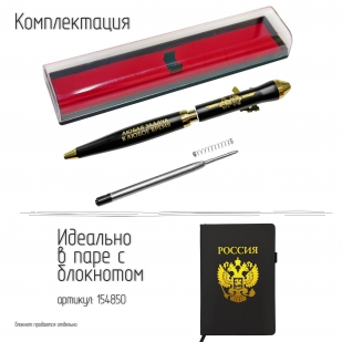 Золотистые декоративные элементы, включая клипсу и торцевые вставки, придают ручке строгий, представительный вид. Тематика оформления – военная и патриотическая, что делает ручку отличным подарком военнослужащим, сотрудникам силовых структур, ветеранам, а также всем, кто дорожит историей и ценит символику силы государства.