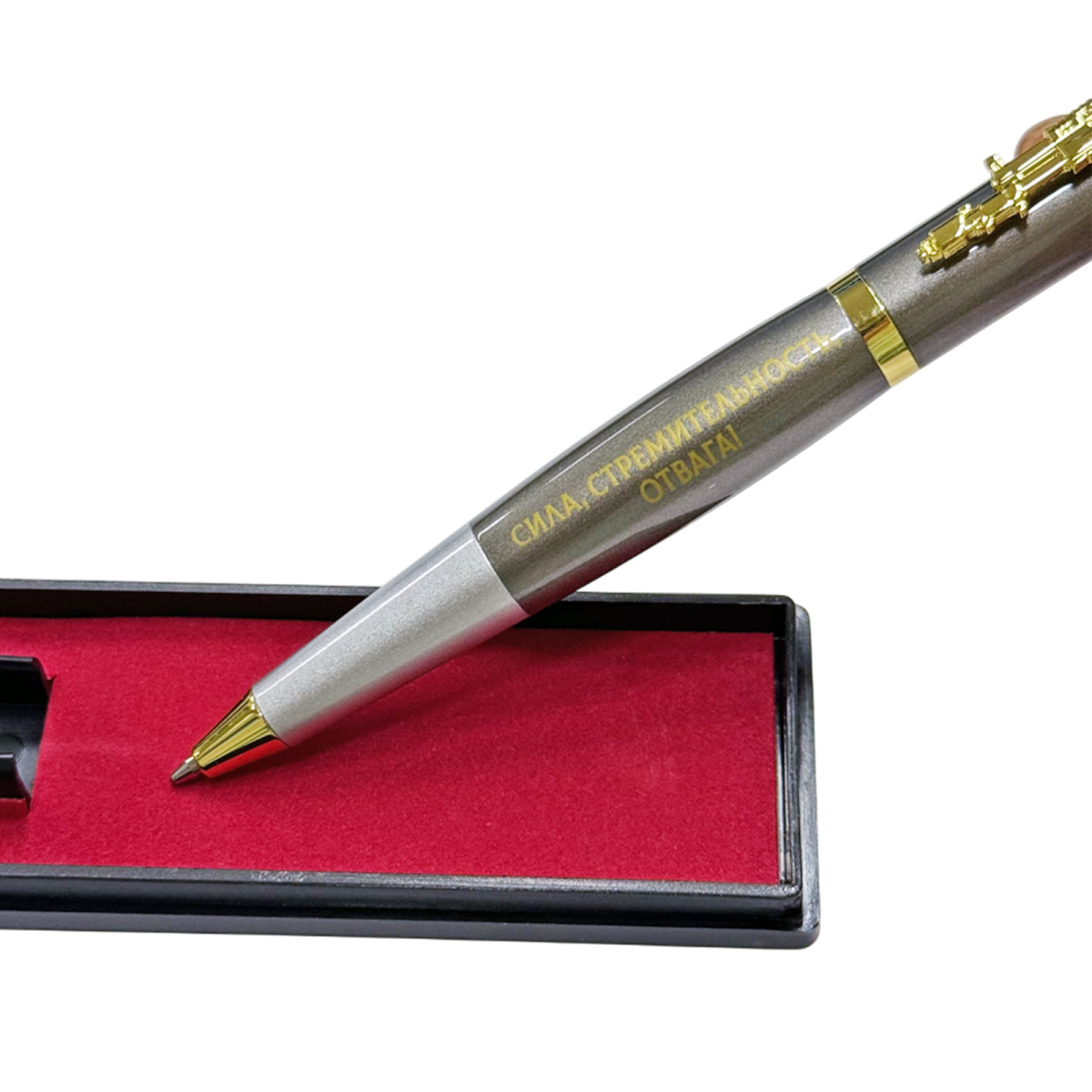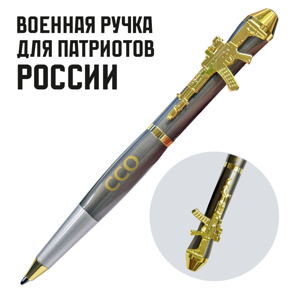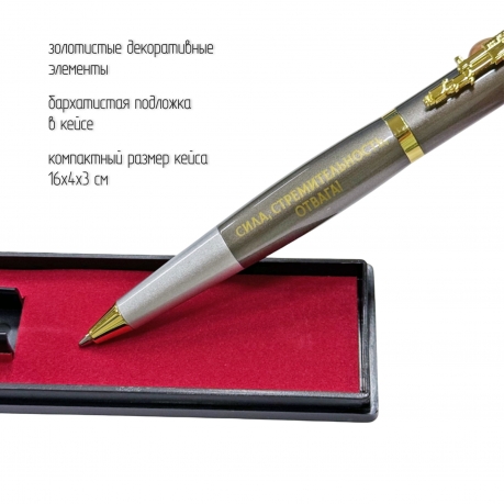 Золотистые декоративные элементы, включая клипсу и торцевые вставки, придают ручке строгий, представительный вид. Тематика оформления – военная и патриотическая, что делает ручку отличным подарком военнослужащим, сотрудникам силовых структур, ветеранам, а также всем, кто дорожит историей и ценит символику силы государства.