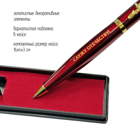 Золотистые декоративные элементы, включая клипсу и торцевые вставки, придают ручке строгий, представительный вид. Тематика оформления – военная и патриотическая, что делает ручку отличным подарком военнослужащим, сотрудникам силовых структур, ветеранам, а также всем, кто дорожит историей и ценит символику силы государства.