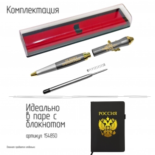 Подарочная шариковая ручка стильный и практичный аксессуар, созданный для тех, кто ценит надёжность, символику и выразительный дизайн. Корпус выполнен из прочного пластика с гладким сатиновым покрытием, благодаря чему ручка комфортно лежит в руке, не скользит и подходит для длительной письменной работы. Наконечник корпуса выполнен в форме боеголовки ракеты «Орешник», подчёркивая патриотичный характер ручки.