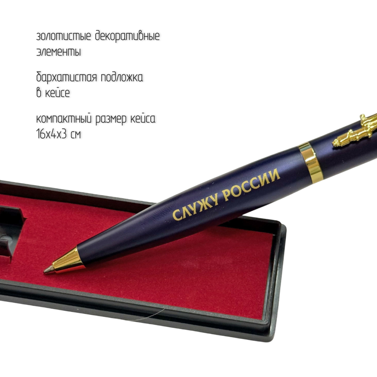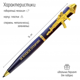 Золотистые декоративные элементы, включая клипсу и торцевые вставки, придают ручке строгий, представительный вид. Тематика оформления – военная и патриотическая, что делает ручку отличным подарком военнослужащим, сотрудникам силовых структур, ветеранам, а также всем, кто дорожит историей и ценит символику силы государства.