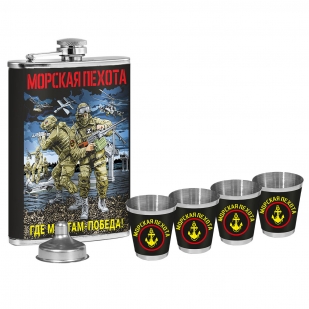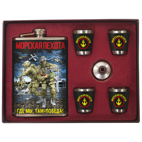 Подарочный набор Морская пехота "Где мы, там – Победа!" с фляжкой и стопками – нержавеющая сталь 304; фляжка 260 мл (9 oz); 4 стопки по 50 мл; воронка