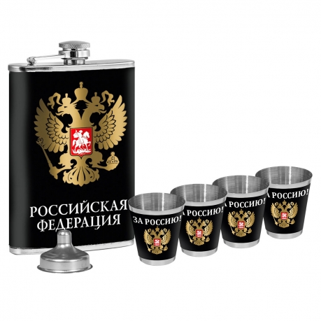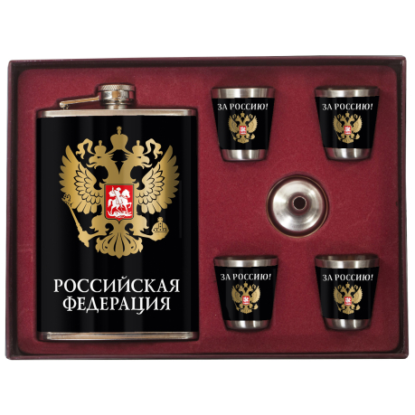 Подарочный набор Российская Федерация "За Россию!" с фляжкой и стопками – нержавеющая сталь 304; фляжка 260 мл (9 oz); 4 стопки по 50 мл; воронка