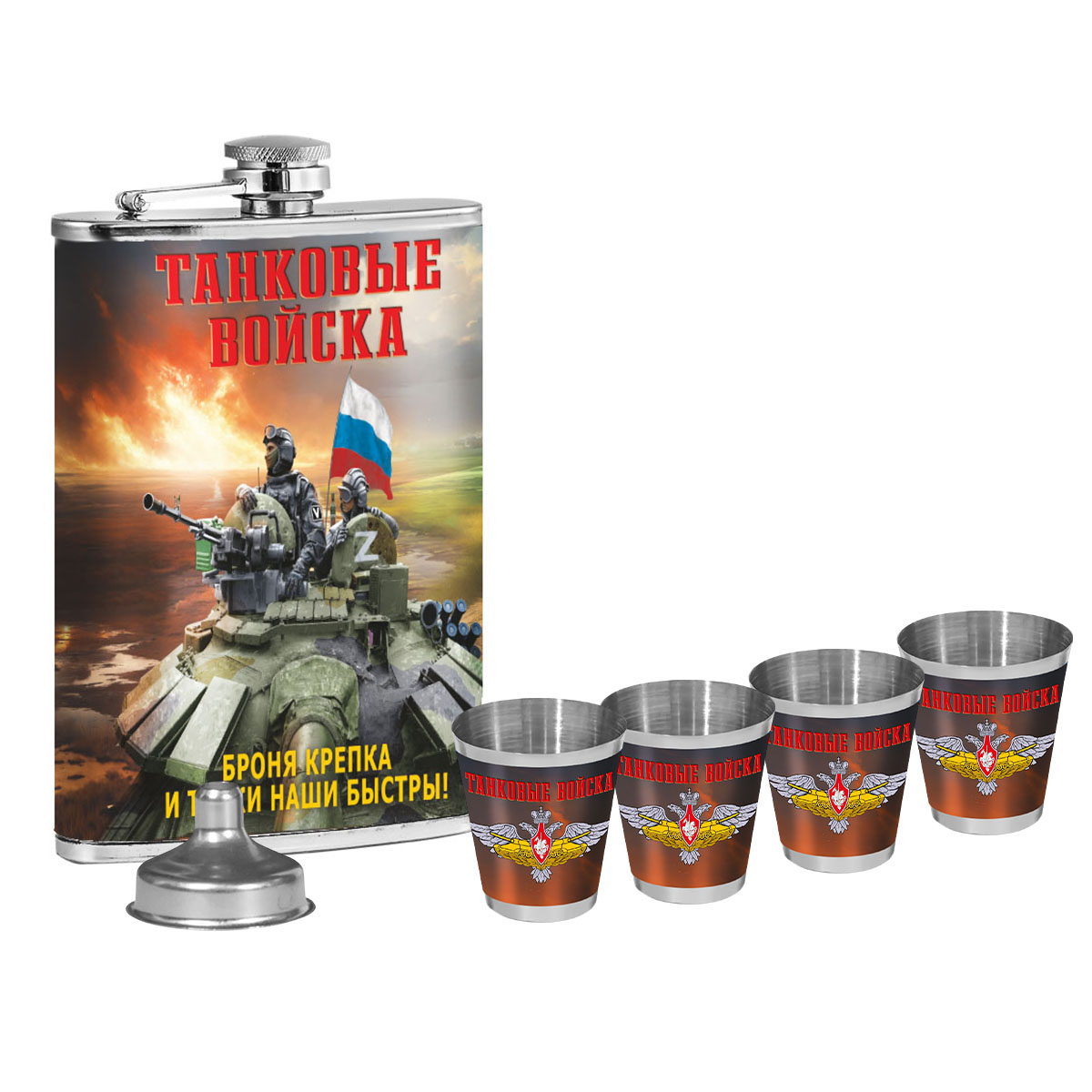 Подарочный набор Танковые войска "Броня крепка и танки наши быстры!" с фляжкой и стопками – нержавеющая сталь 304; фляжка 260 мл (9 oz); 4 стопки по 50 мл; воронка