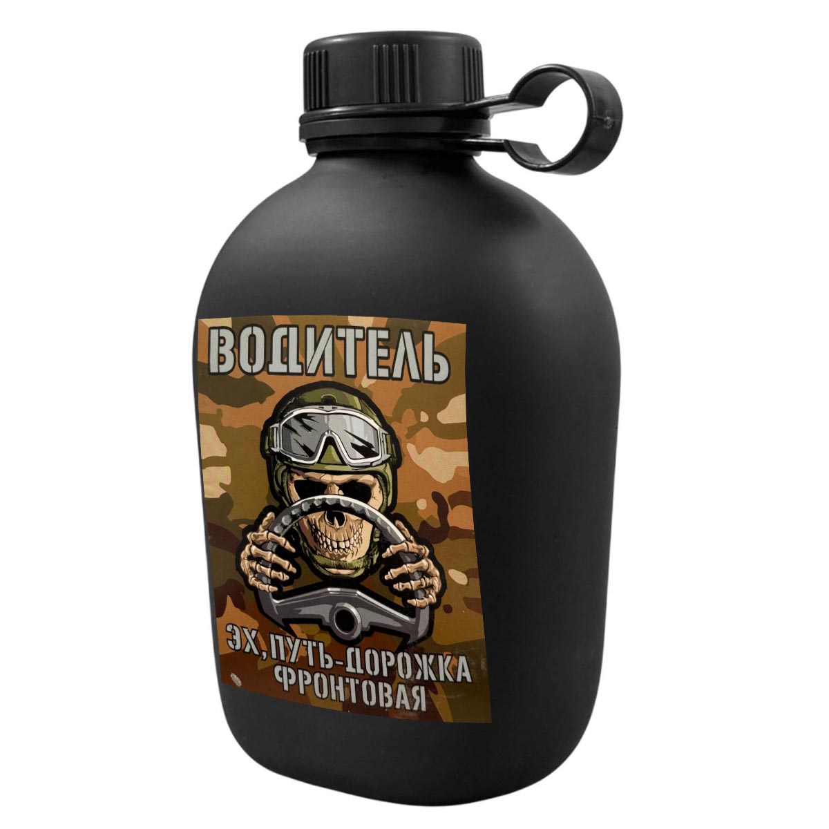 Походная фляга СВО "Эх, путь-дорожка фронтовая..." с виниловой наклейкой (1 л, 19.5 х12 см)