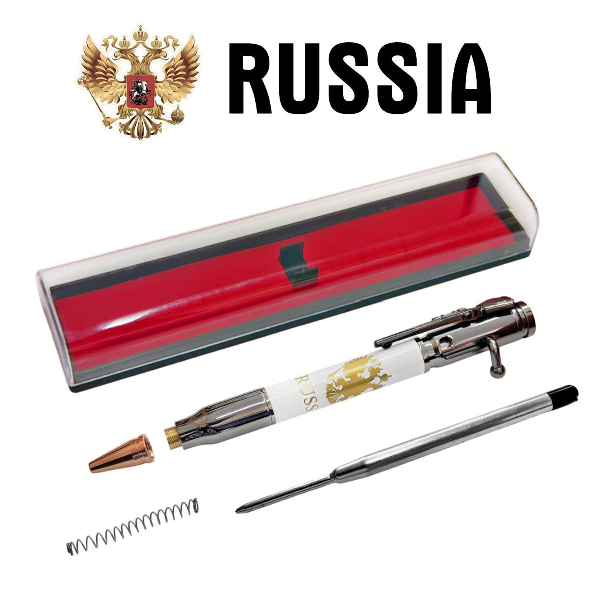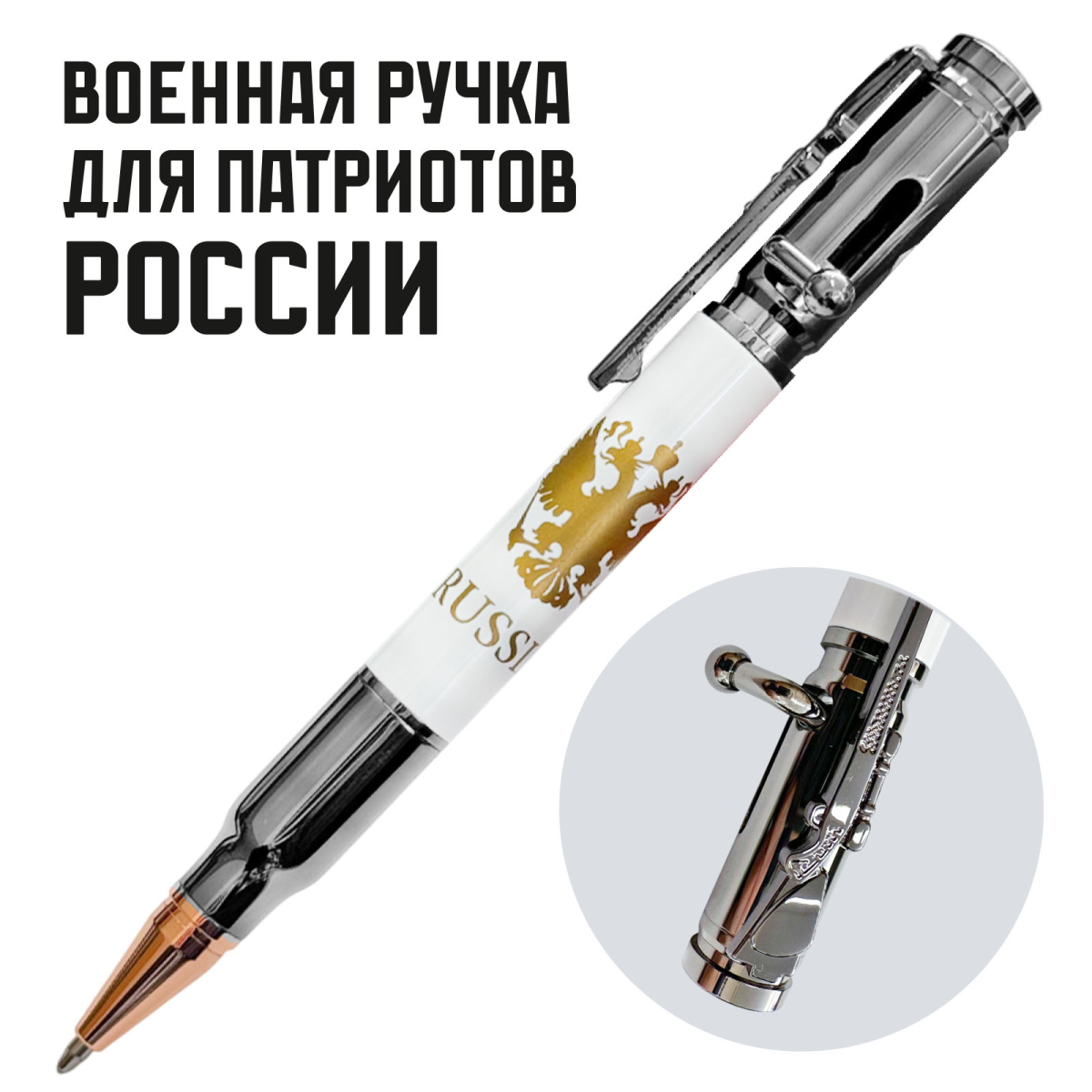Купить ручку патрон "RUSSIA" с гербом РФ можно в Военпро, с удобной доставкой по всей РФ.