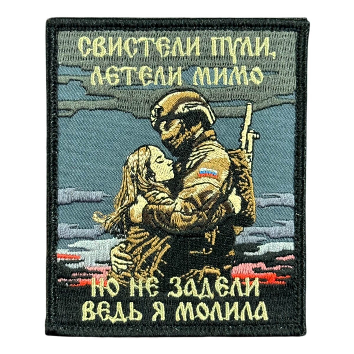 Шеврон на липучке с надписью "Свистели пули, летели мимо , но не задели. Ведь я молила" (10х8 см)