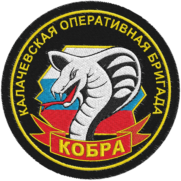 Круглый шеврон ВВ с изображением кобры и надписью внизу на красной ленте: КОБРА, а также по кругу вышито: Калачевская оперативная бригада.