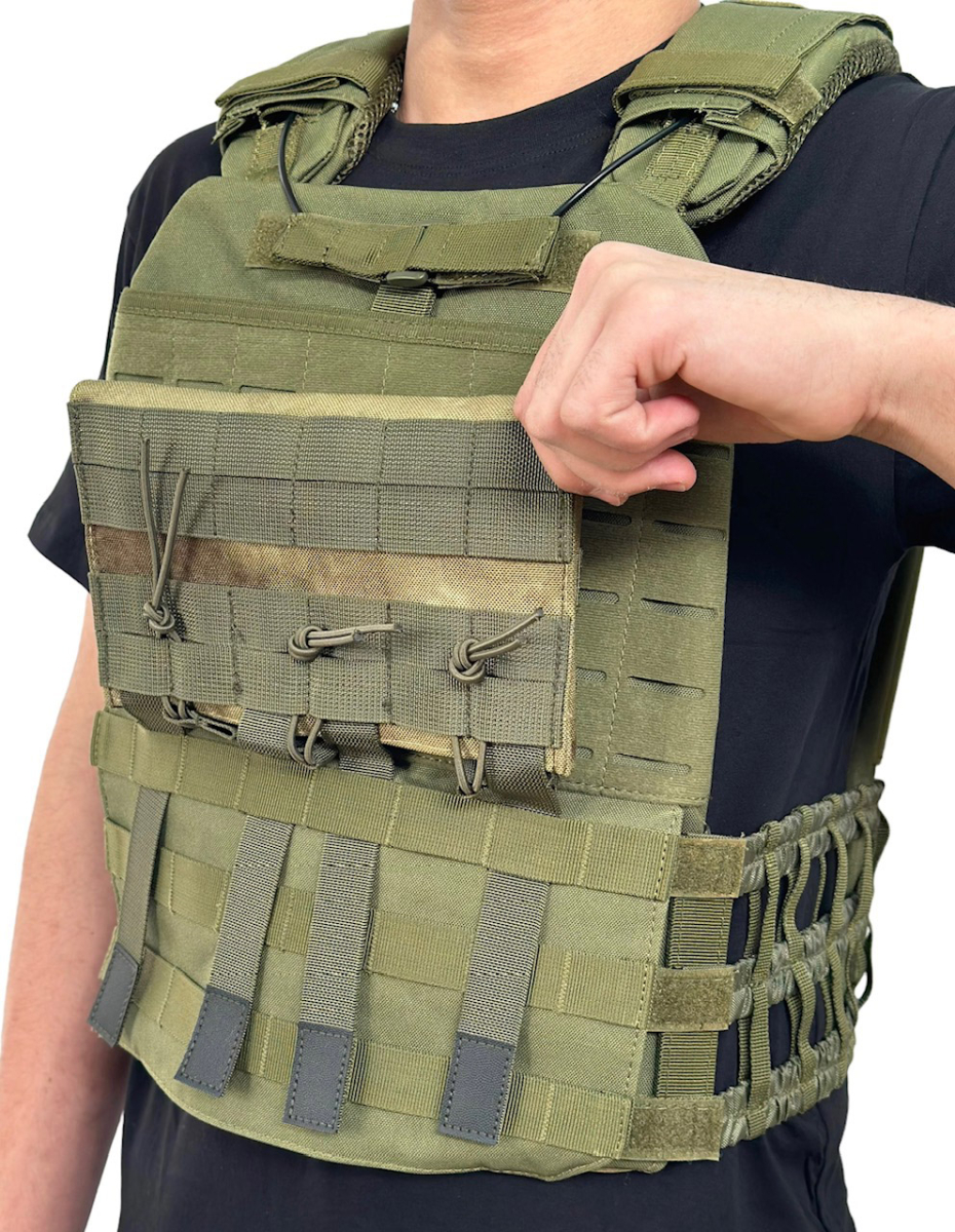 Подсумок крепится на снаряжении за счет строп MOLLE. Для фиксации магазина внутри подсумка используется эластичный шнур с пуллером.