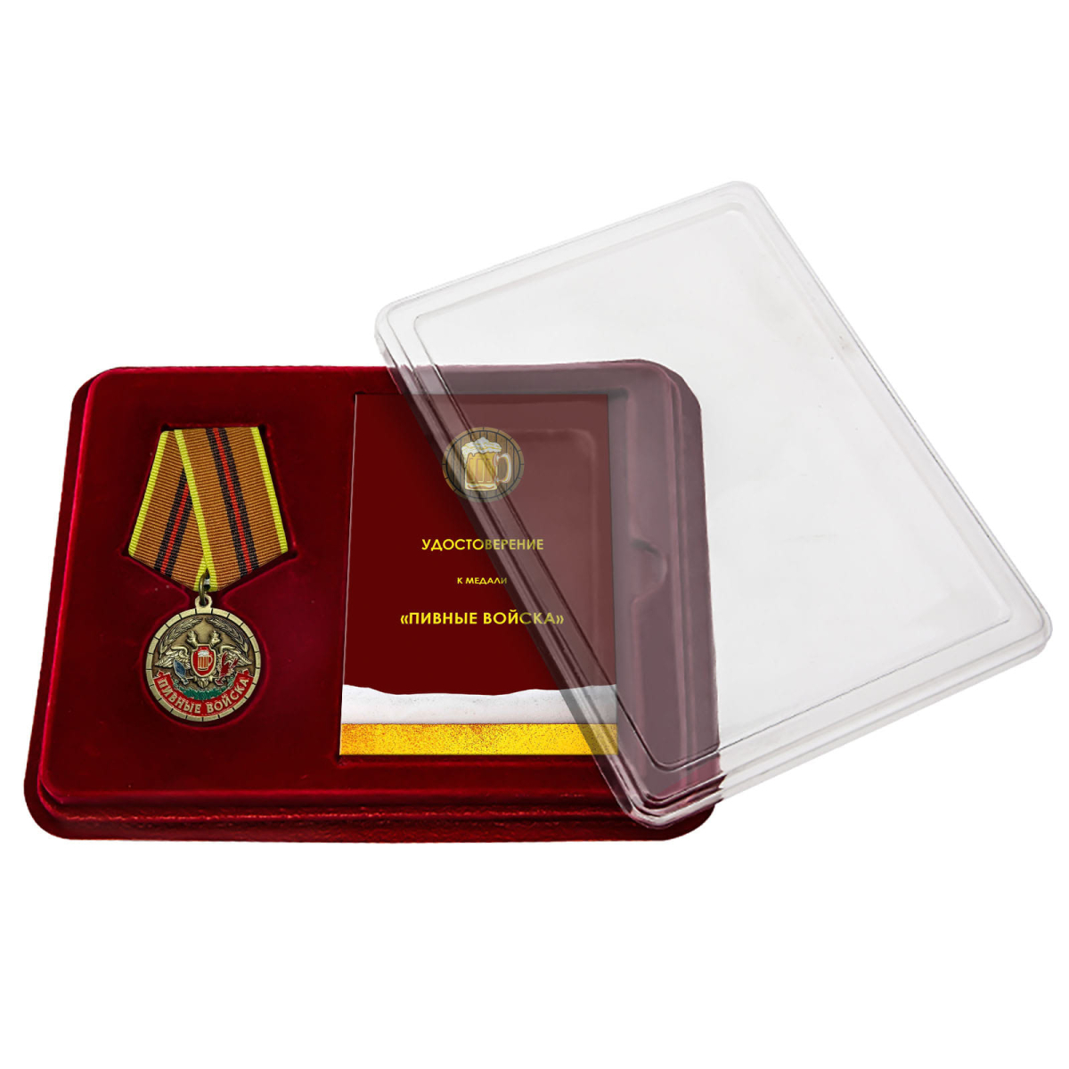 Купить шуточную медаль «Пивные войска. Ветеран» в футляре с прозрачной крышкой  из латуни высокого качества в военторге Военпро по выгодной цене с доставкой по Москве и всей России.
