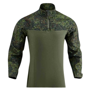 Рубашка выполнена в комбинированной конструкции: рукава и верхняя часть – из камуфляжной ткани RipStop, центральная часть корпуса выполнена из хлопковой трикотажной ткани однотонного хаки цвета. Такое решение повышает воздухопроницаемость и комфорт при ношении под разгрузочным снаряжением или бронежилетом. Модель оснащена воротником-стойкой с короткой молнией, обеспечивающей удобство надевания и регулировку вентиляции. Манжеты регулируются при помощи велкро. На плечах размещены панели велкро для крепления шевронов. Комбинация материалов обеспечивает баланс прочности и комфорта: камуфляжные элементы устойчивы к износу, а хлопковая центральная часть улучшает терморегуляцию.