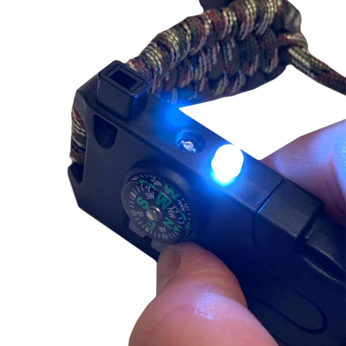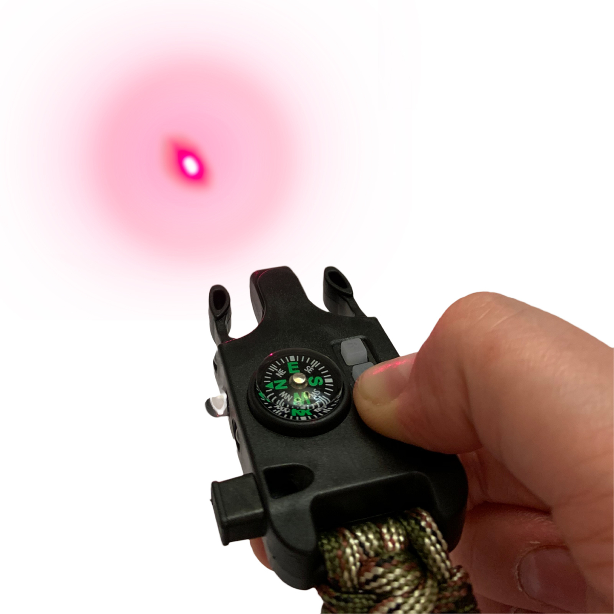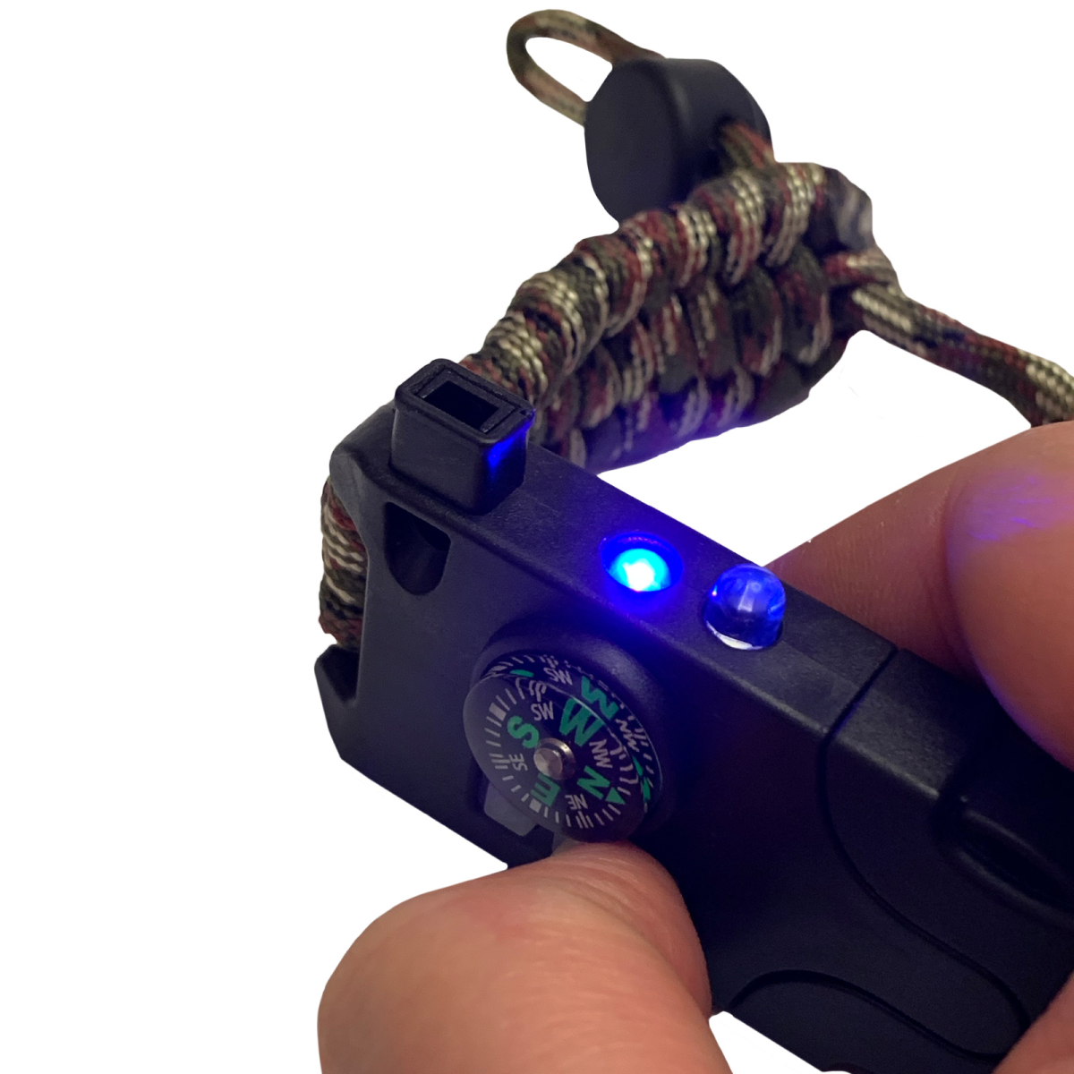 Дополнительно тактический браслет оснащен ультрафиолетовым фонариком для проверки подлинности купюр. Также имеется высокомощная лазерная указка с дальностью действия до 2 километров.
