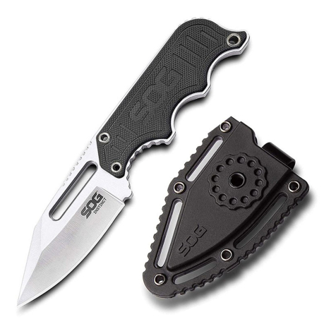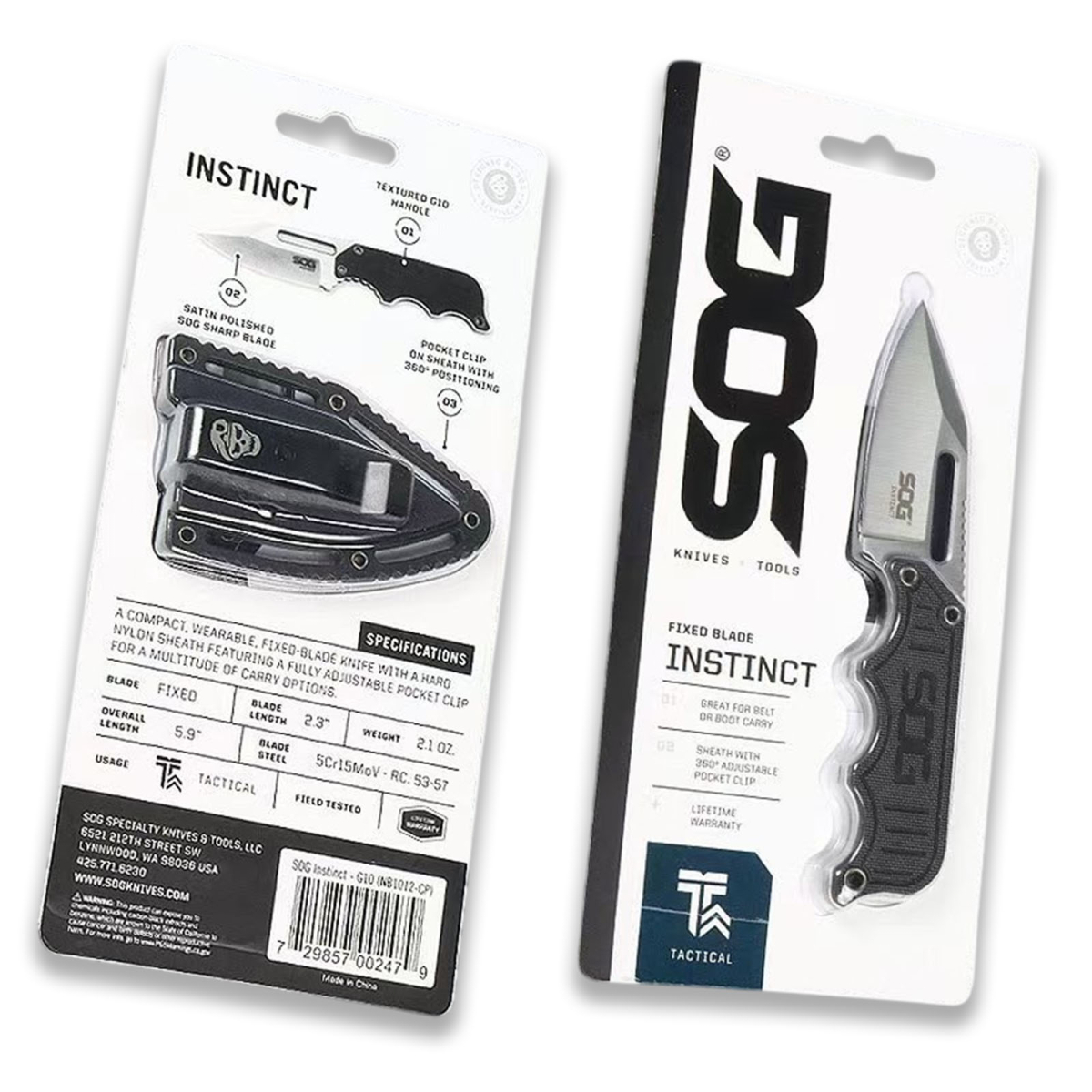 Жёсткие формованные ножны из нейлона оснащены регулируемой клипсой с возможностью вращения на 360°, позволяя носить нож вертикально, горизонтально, на ботинке, на ремне, на стропах MOLLE или на рюкзаке. Компактность и малый вес делают нож SOG Instinct G10 идеальным вариантом скрытого ношения, нож легко прячется под одеждой и быстро извлекается одной рукой.