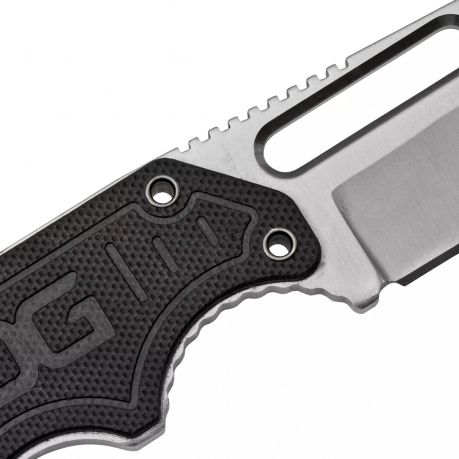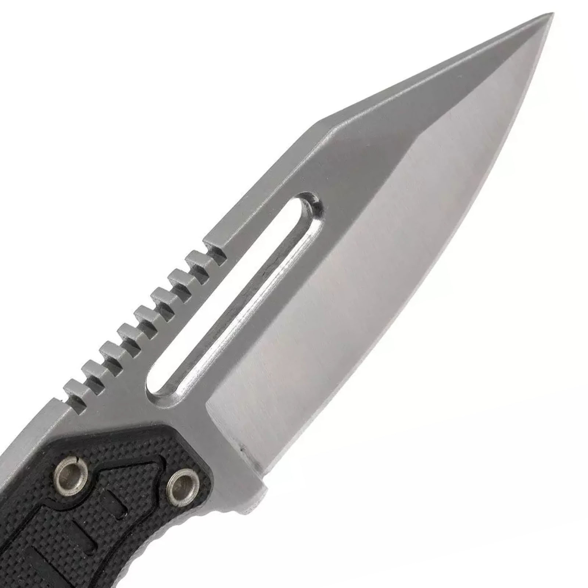 Рукоять из текстурированного G10 обеспечивает цепкий хват даже мокрыми руками, а выемки под пальцы и выраженное углубление для упора дают полный контроль над ножом при любой технике использования. Фуллтанг конструкция повышает общую надёжность инструмента.