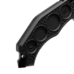 Рукоять выполнена из ударопрочного стеклонаполненного нейлона GFN-PA66. Узнаваемый “fish scale” текстурный рисунок гарантирует цепкий хват в перчатках, мокрых руках и при активной работе. Хвостовик ножа оснащён стеклобоем, а на торце предусмотрено отверстие под темляк.
