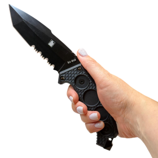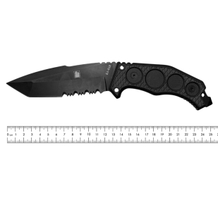 Клинок выполнен из инструментальной стали D2, популярного материала среди тактических ножей благодаря высокой стойкости к износу и отличному удержанию режущей кромки. Геометрия Tanto обеспечивает уверенное проникновение острия, а частичный серрейтор легко справляется с ремнями, синтетикой, канатами и плотными материалами.