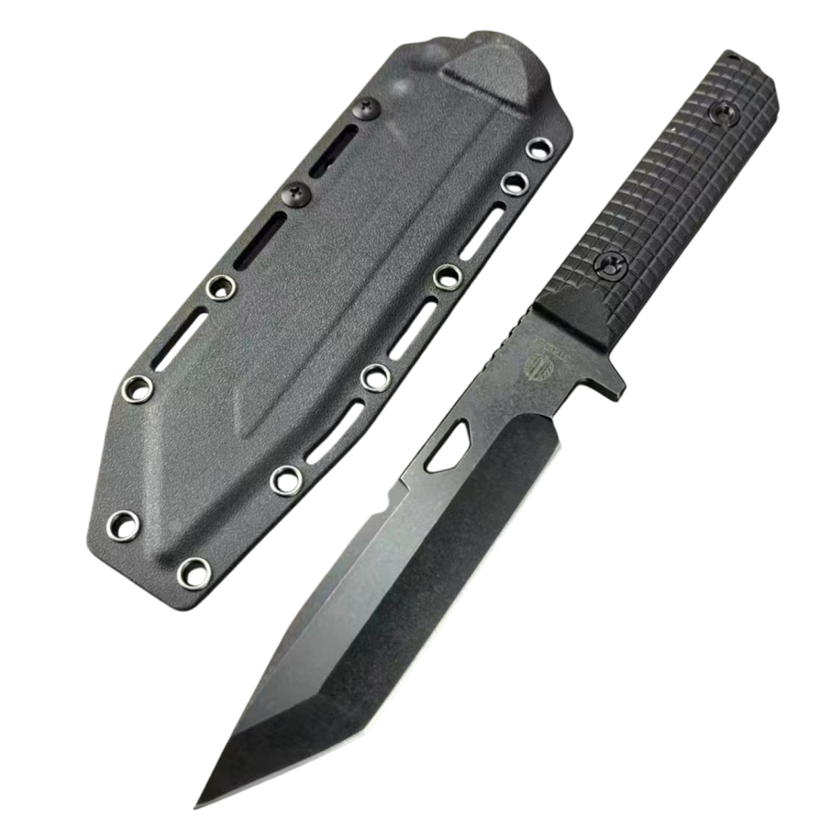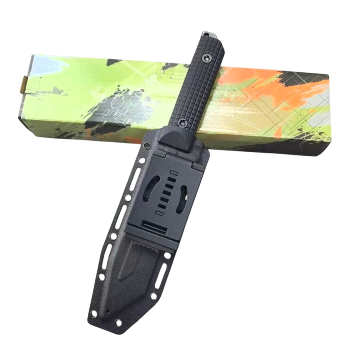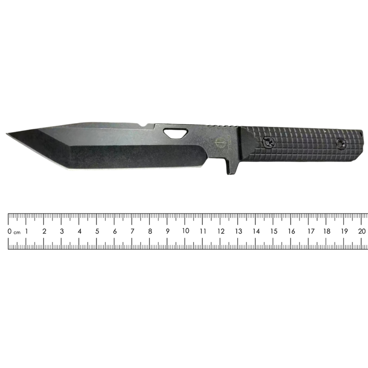 Финиш granite-wash на лезвии скрывает рабочие следы, оставляя нож функционально аккуратным даже после активного использования. Рукоять выполнена из G10 с рельефной сетчатой текстурой, что обеспечивает надёжный хват в перчатках или мокрыми руками. Full-tang конструкция делает нож монолитным и готовым к серьёзной работе.