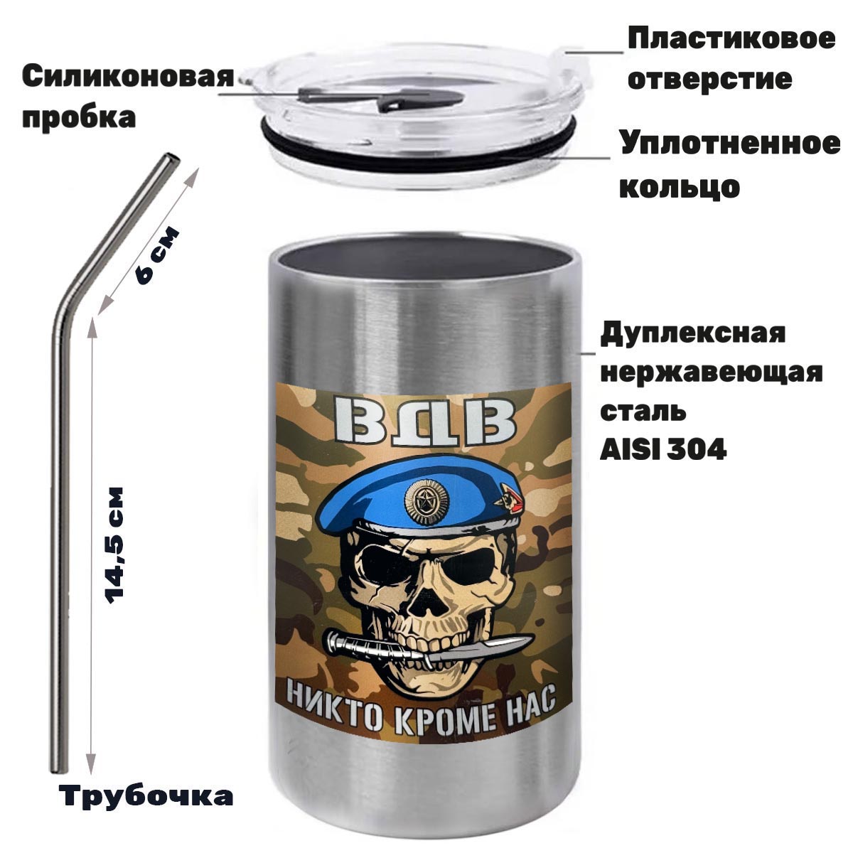 Термокружка с виниловой наклейкой череп ВДВ "Никто, кроме нас"