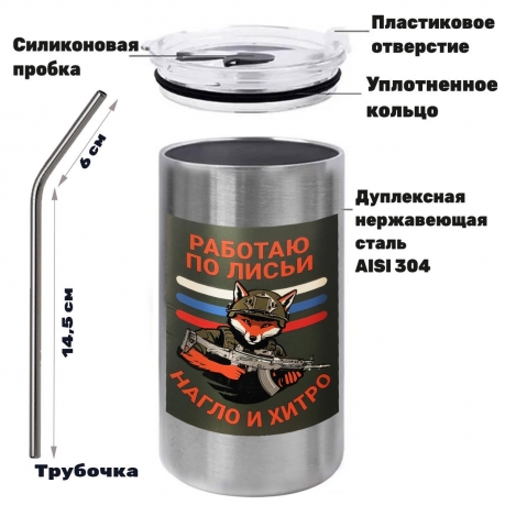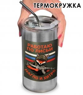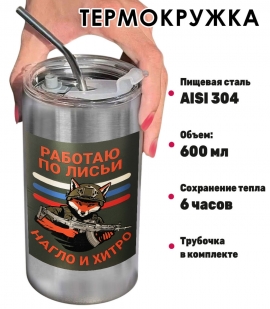 Купить термокружку "Работаю по-лисьи - нагло и хитро" можно в Военпро, с удобной доставкой по всей РФ.