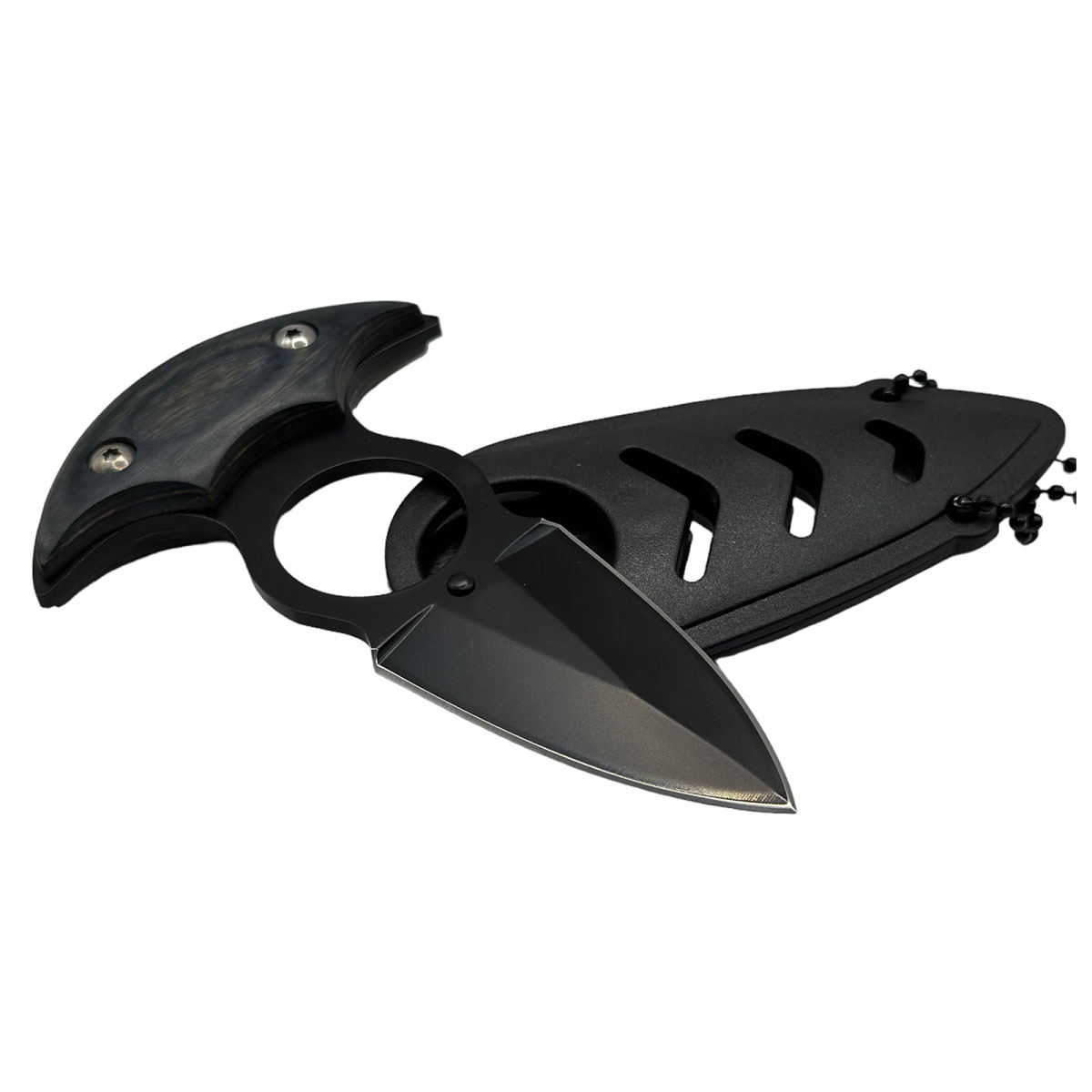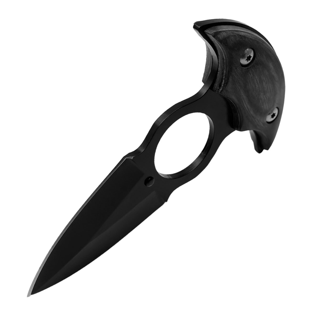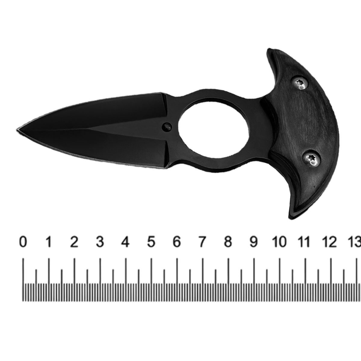 Нож имеет широкий стреловидный клинок. Клинок выполнен из прочной стали 420C, с покрытием для дополнительной защиты от коррозии. Кольцо для пальца в середине конструкции облегчает вес без потери прочности и делает хват более надежным. Т-образная рукоять с накладками из черного дерева небольшая и удобная.
