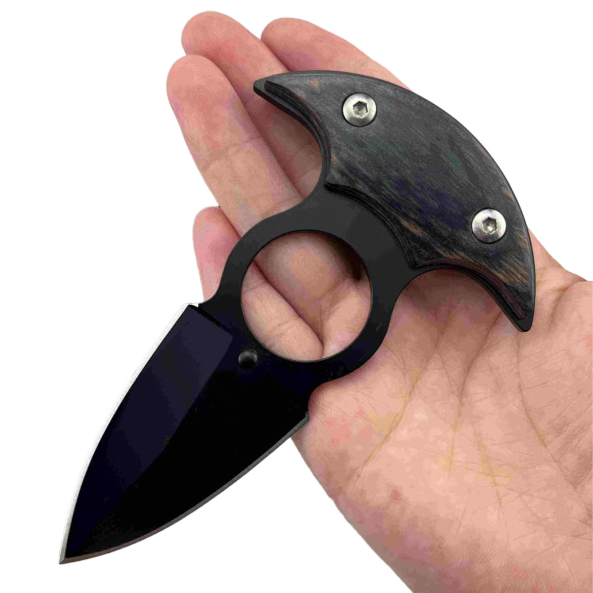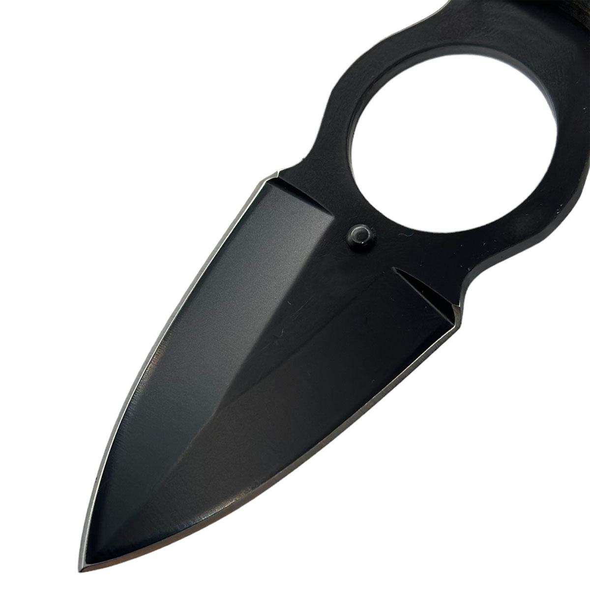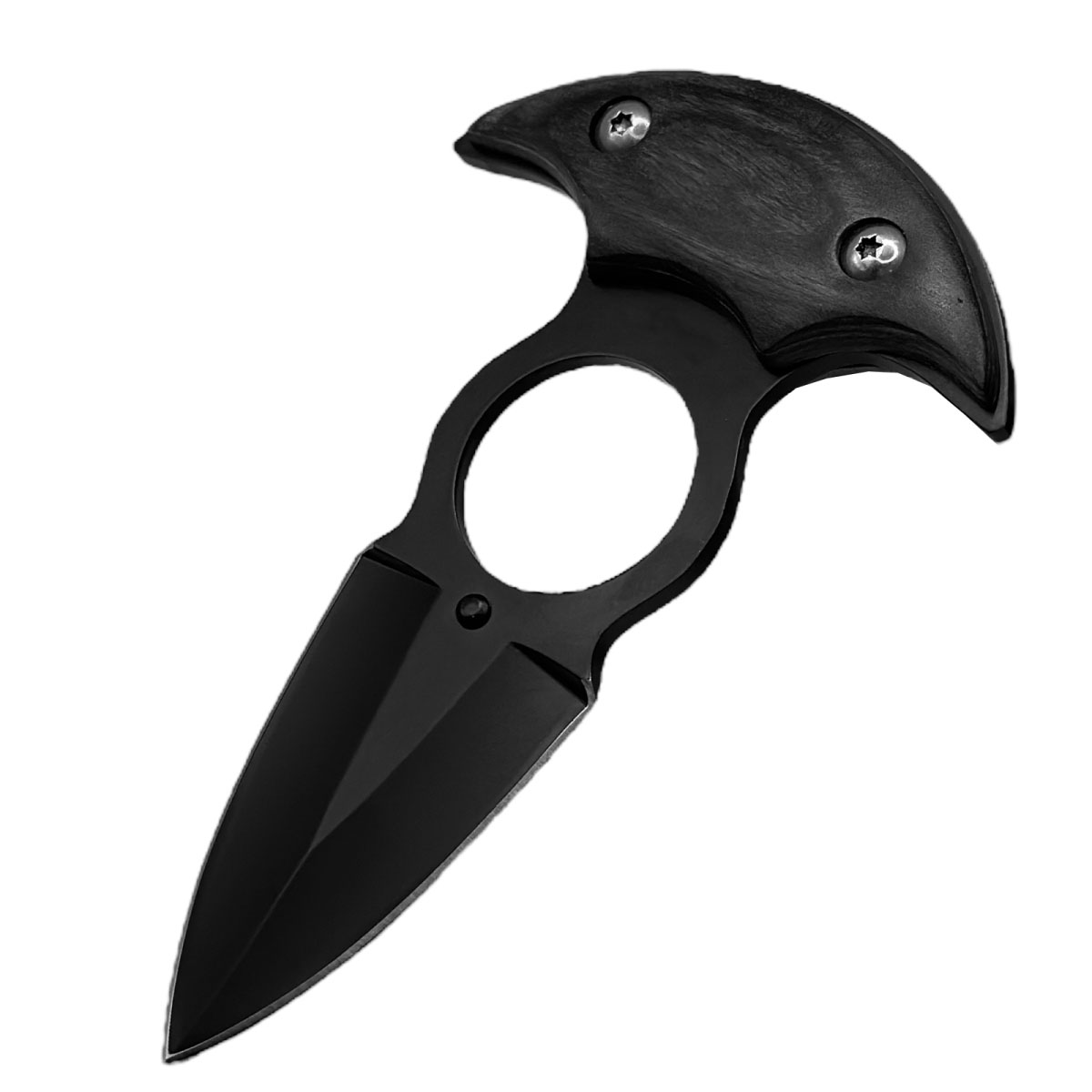 Нож имеет широкий стреловидный клинок. Клинок выполнен из прочной стали 420C, с покрытием для дополнительной защиты от коррозии. Кольцо для пальца в середине конструкции облегчает вес без потери прочности и делает хват более надежным. Т-образная рукоять с накладками из черного дерева небольшая и удобная.